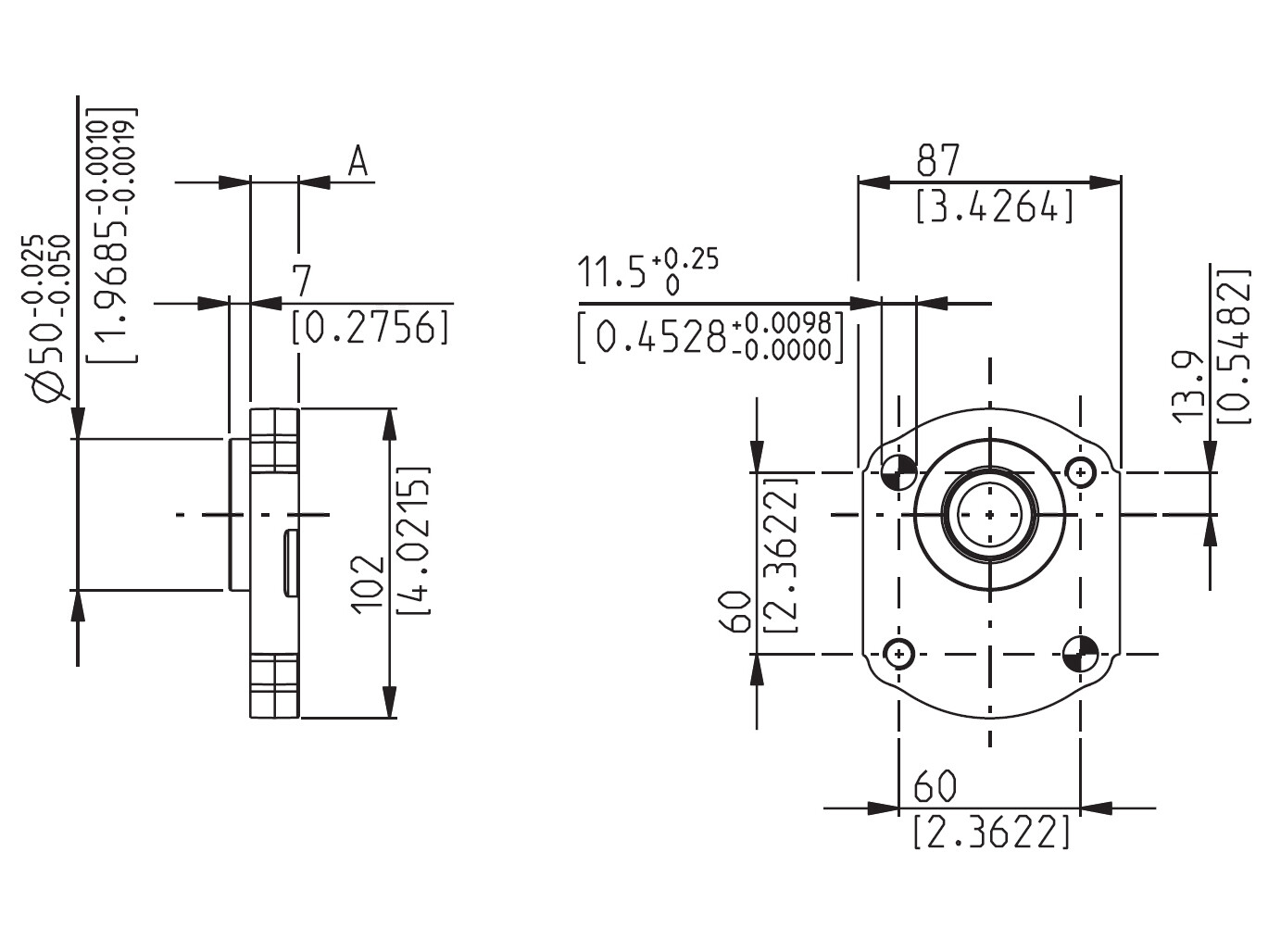 Frontflange (B5): Tysk standard. Reces: ø50 mm. Bolthulsafstand: 60 x 60 mm. Monteringsbolthullernes placering, set fra akselende: Øverste venstre og nederste højre hjørne. Monteringsbolte medfølger.