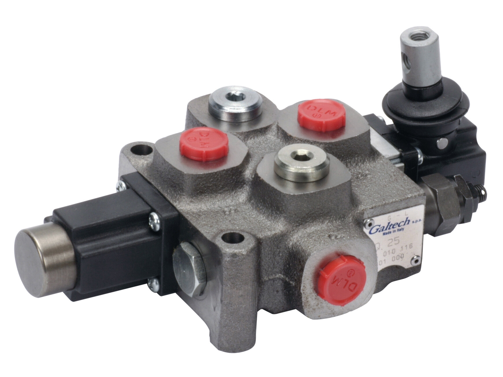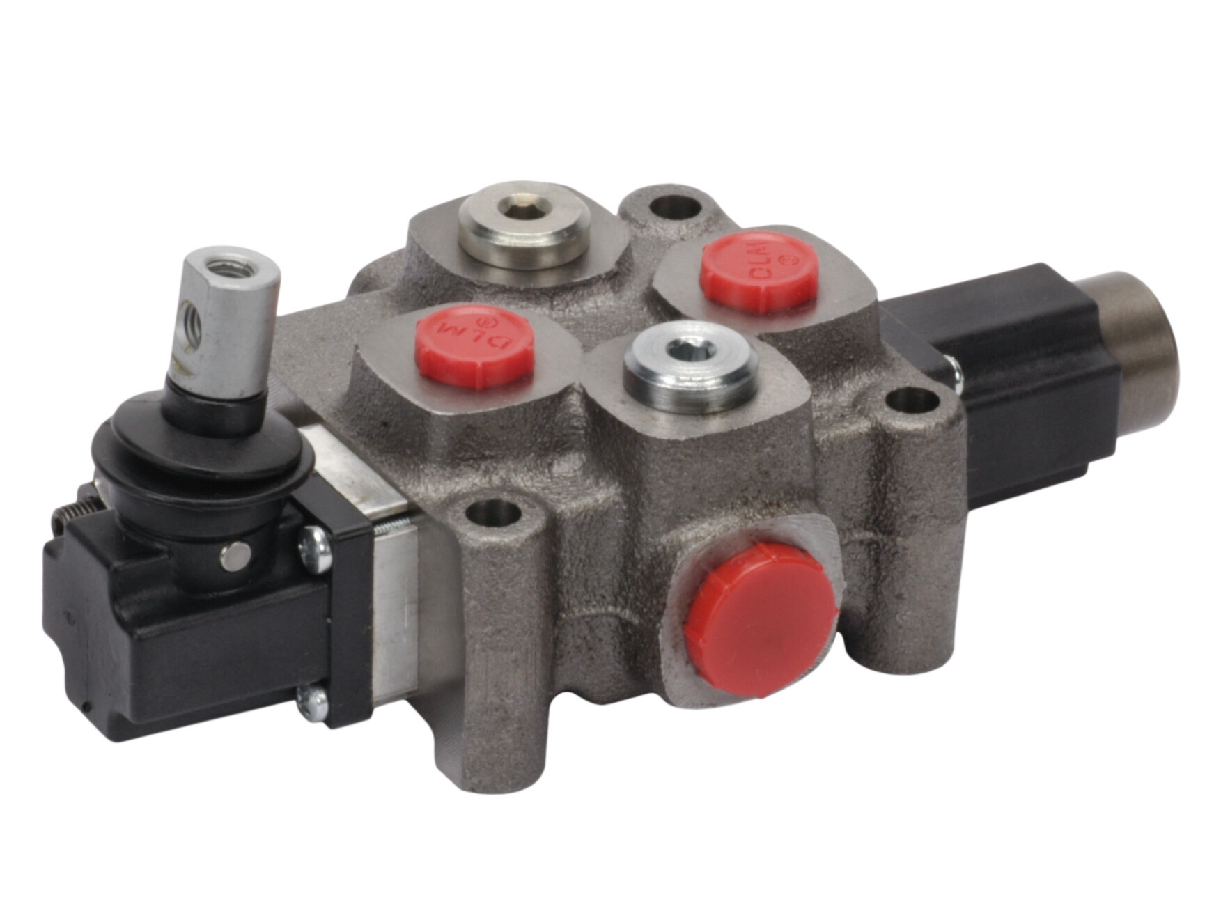 1-sektions Q25 monoblok retningsventil med indbygget trykbegrænsningsventil og een glider. Manuelt aktiveret med håndtag.