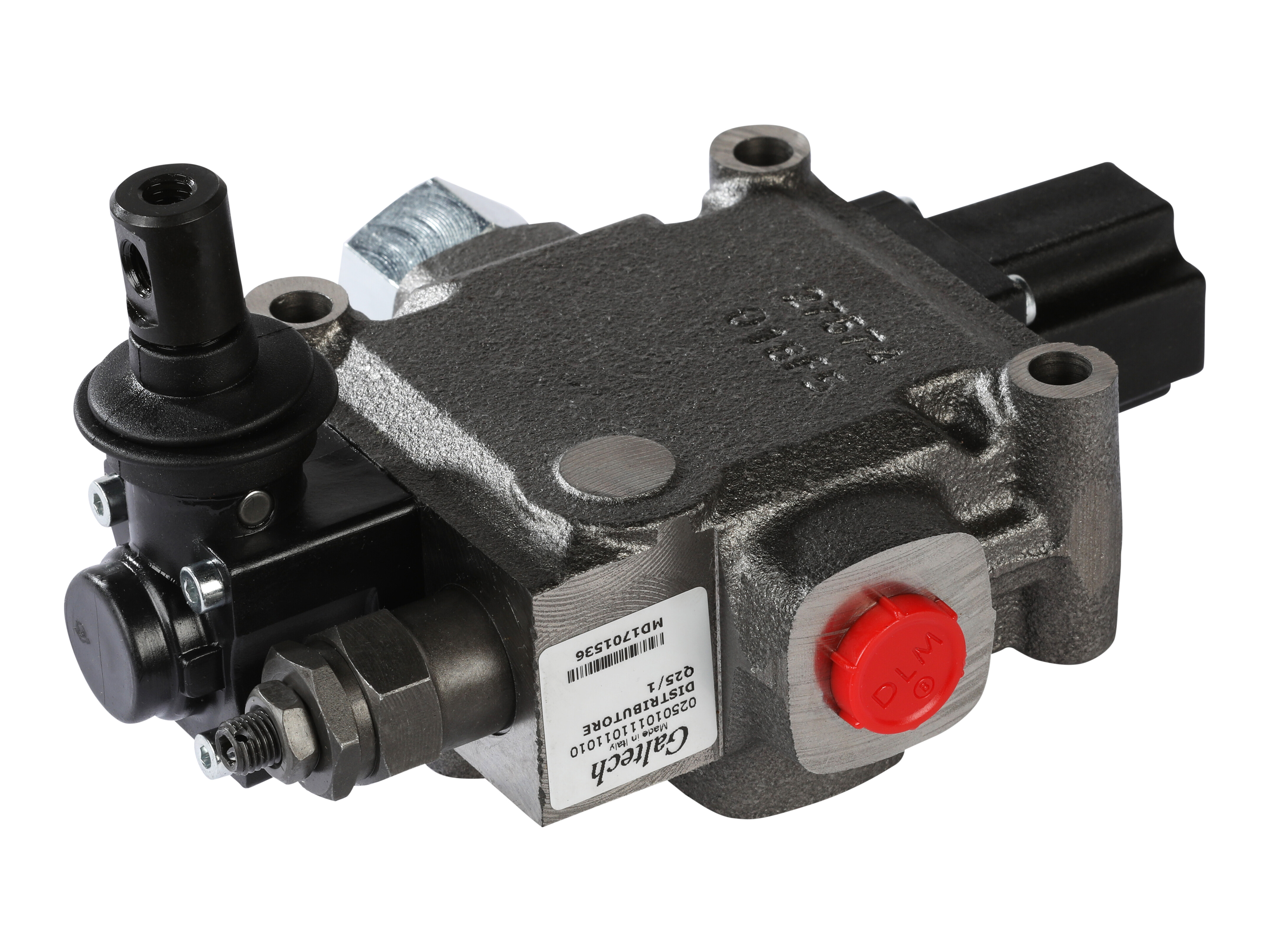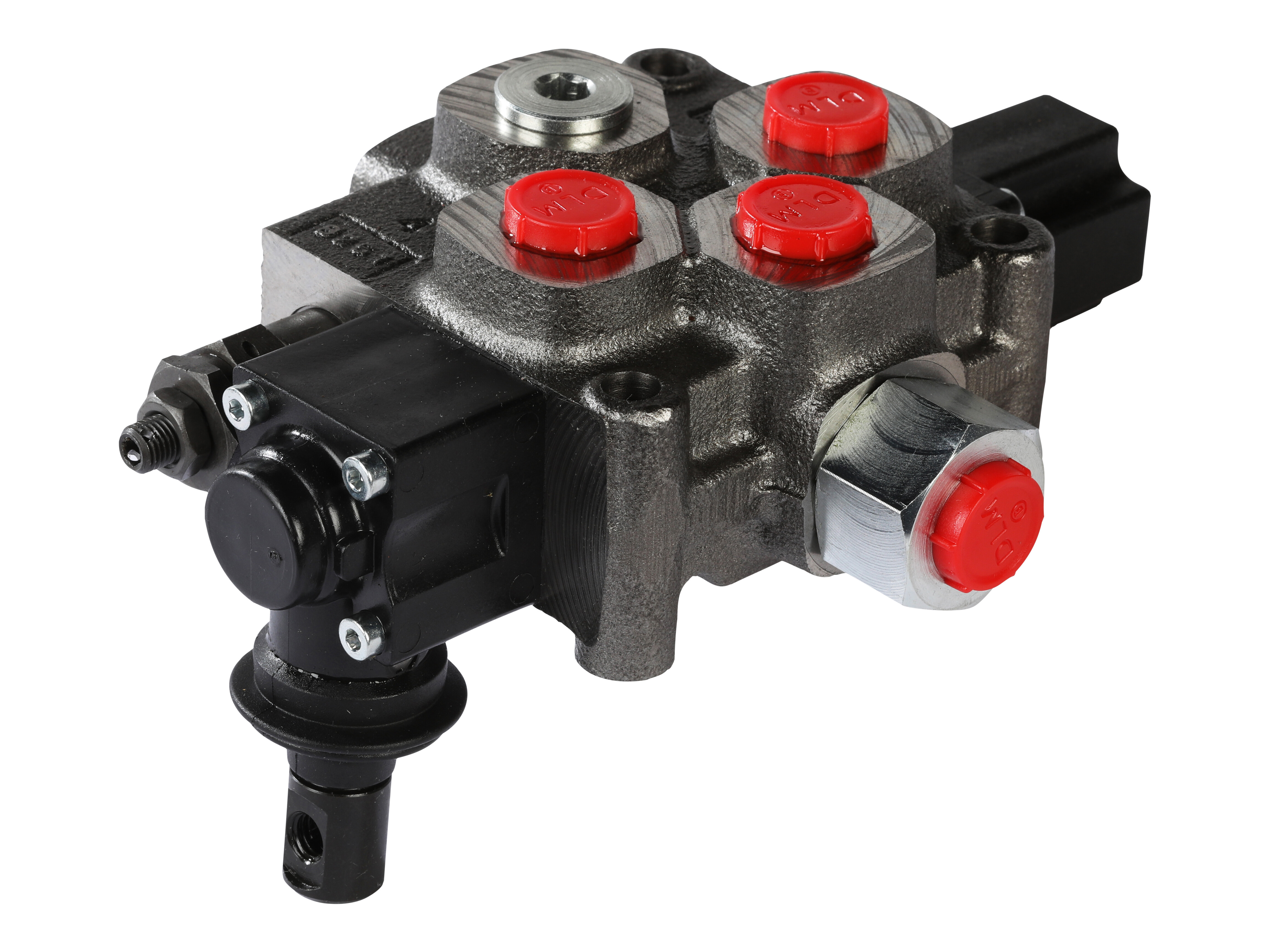 1-sektions Q25 monoblok retningsventil med indbygget trykbegrænsningsventil og een glider. Manuelt aktiveret med håndtag.
