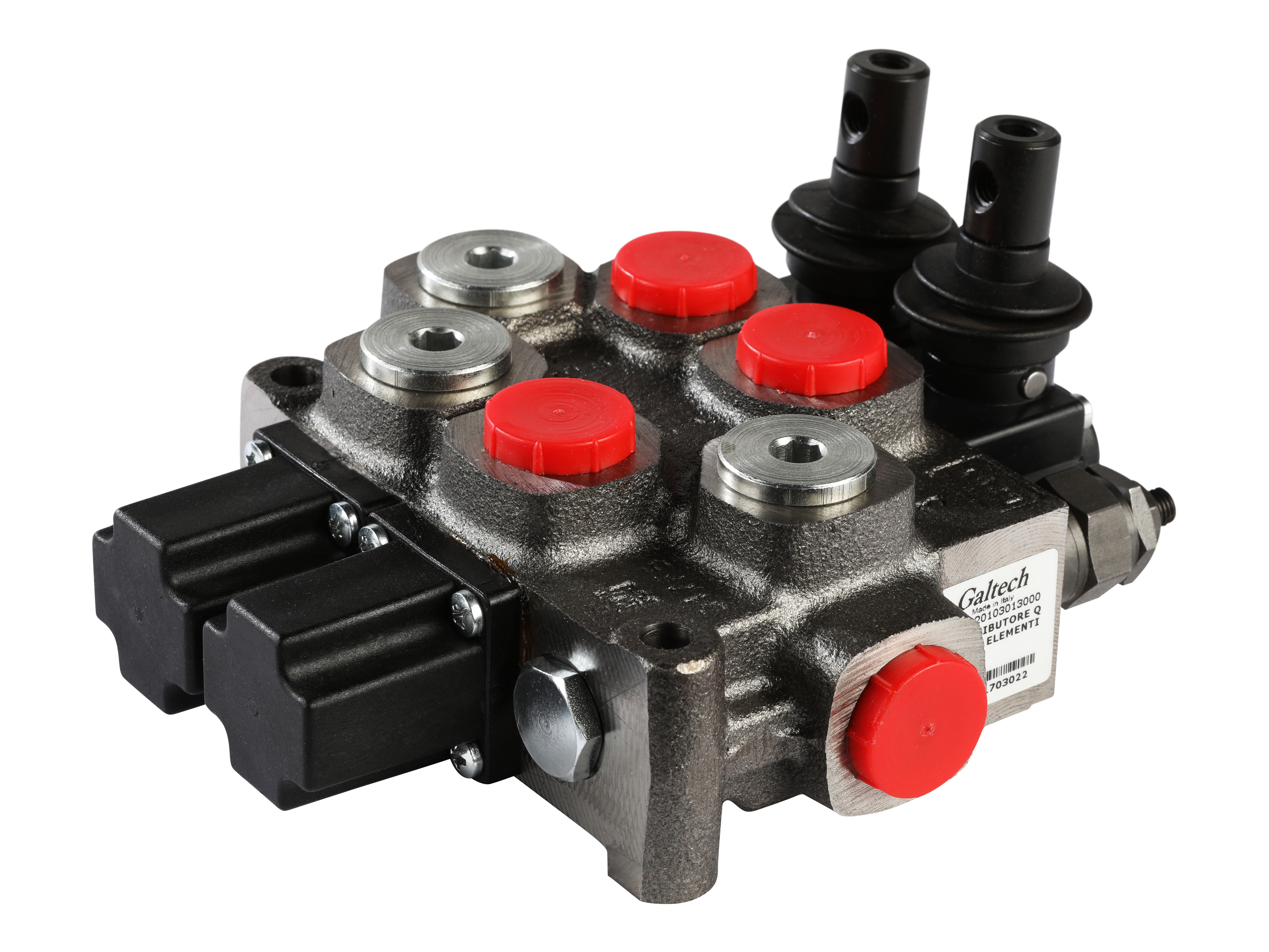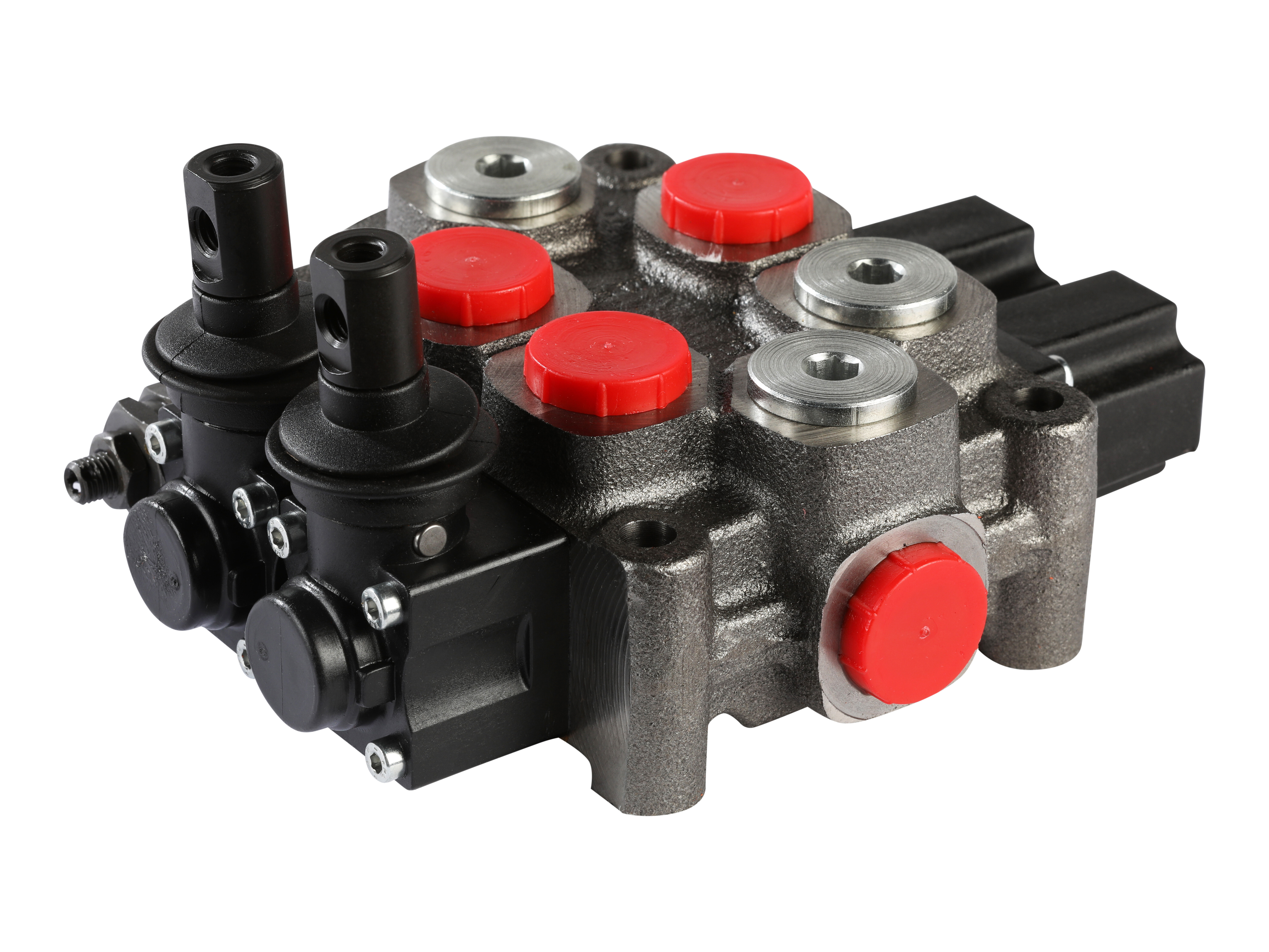 2-sektions Q45 monoblok retningsventil med indbygget trykbegrænsningsventil. Manuelt aktiveret med håndtag.