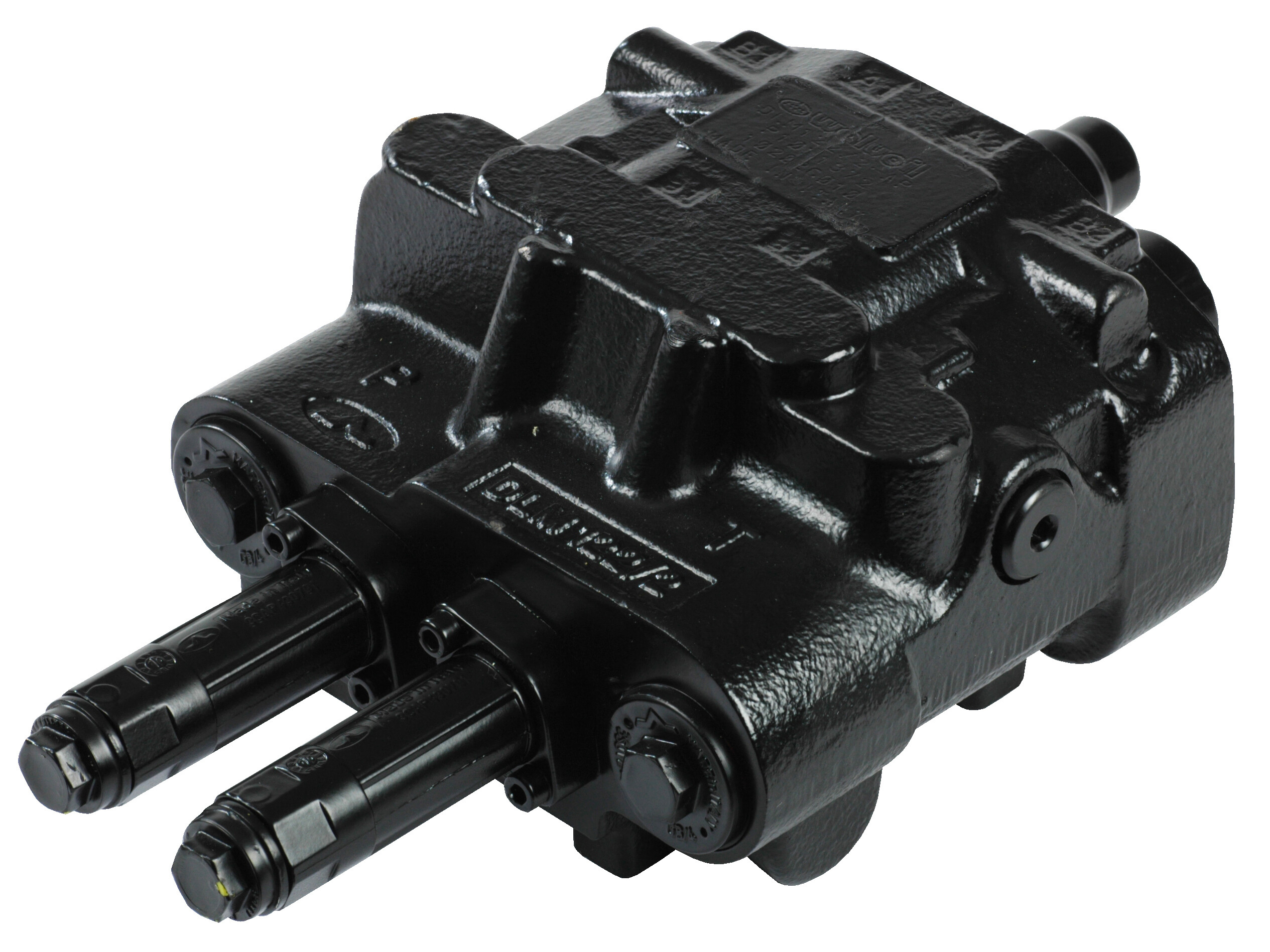2 sektions DLM122 monoblok retningsventil med indbygget trykbegrænsningsventil og 2 glidere (parallelt forbundne), manuelt aktiverede med kabler og håndtag. "Frontlæsserventil" for Load Sensing systemer.
