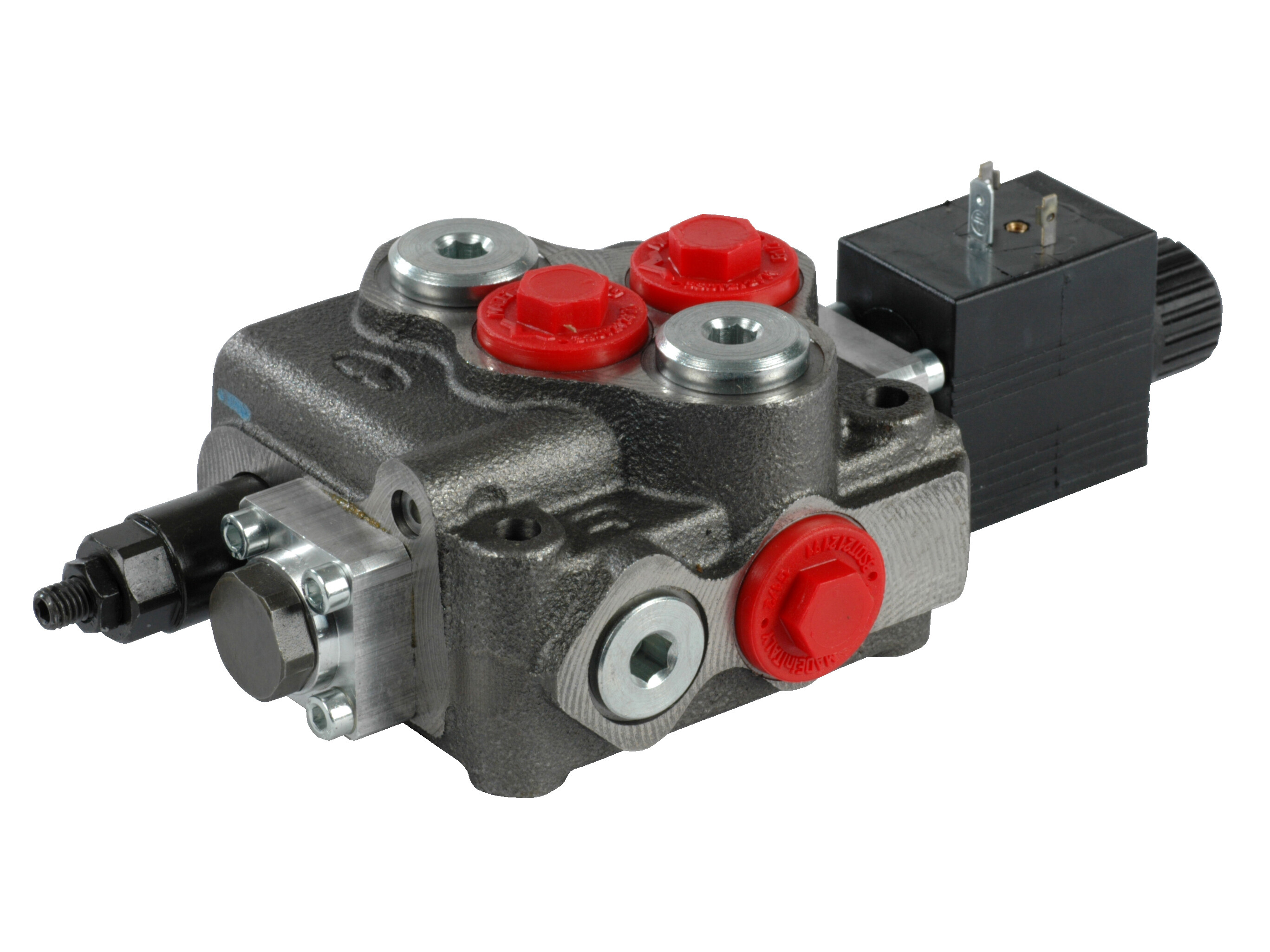 1-sektions SD5 monoblokventil med indbygget trykbegrænsningsventil. Elektrisk (12 Vdc) aktivering.
