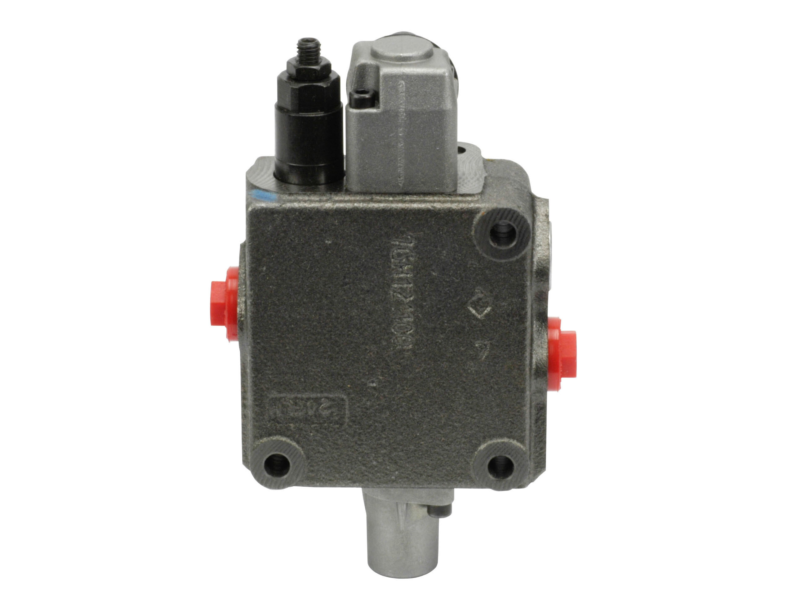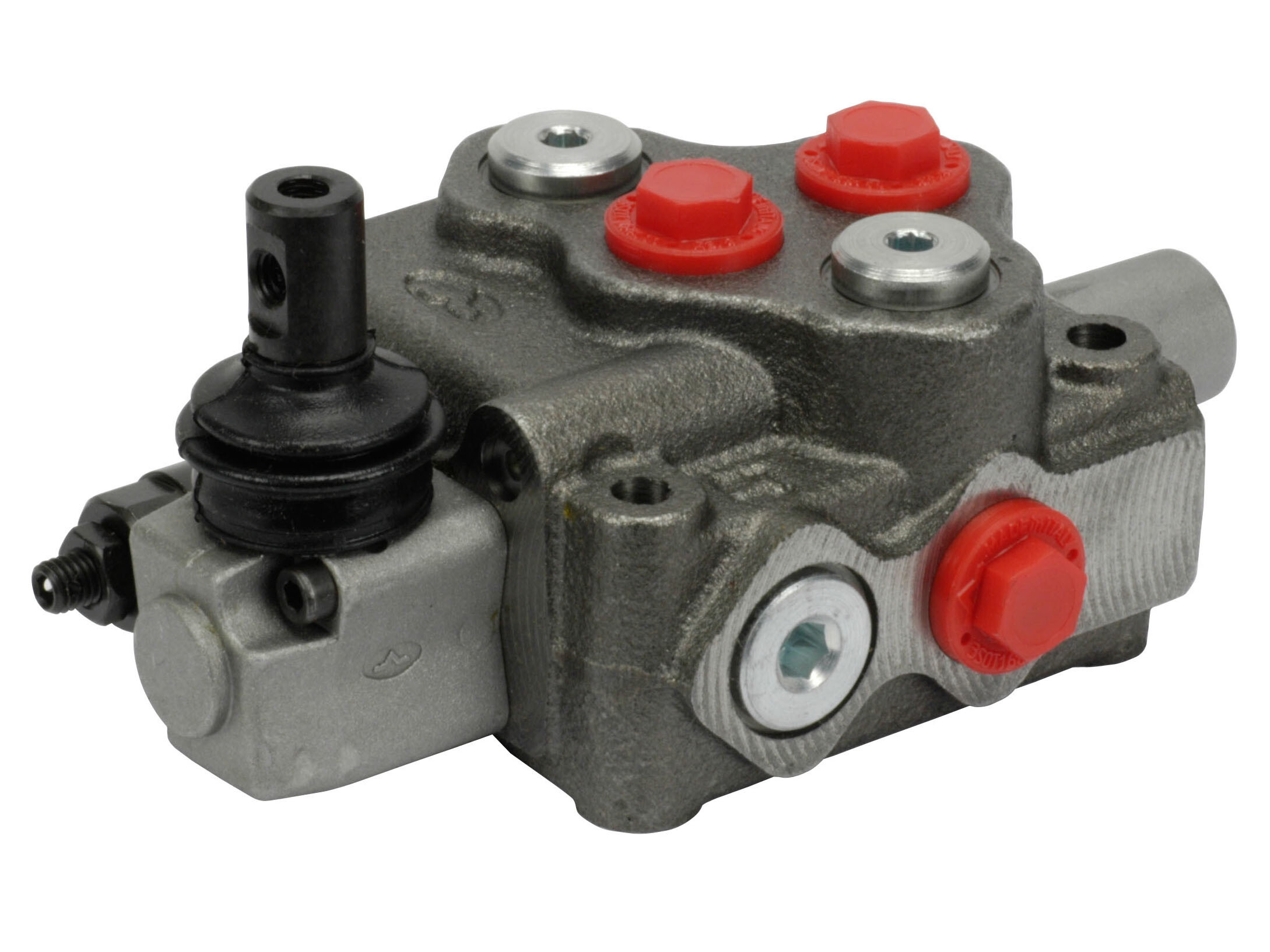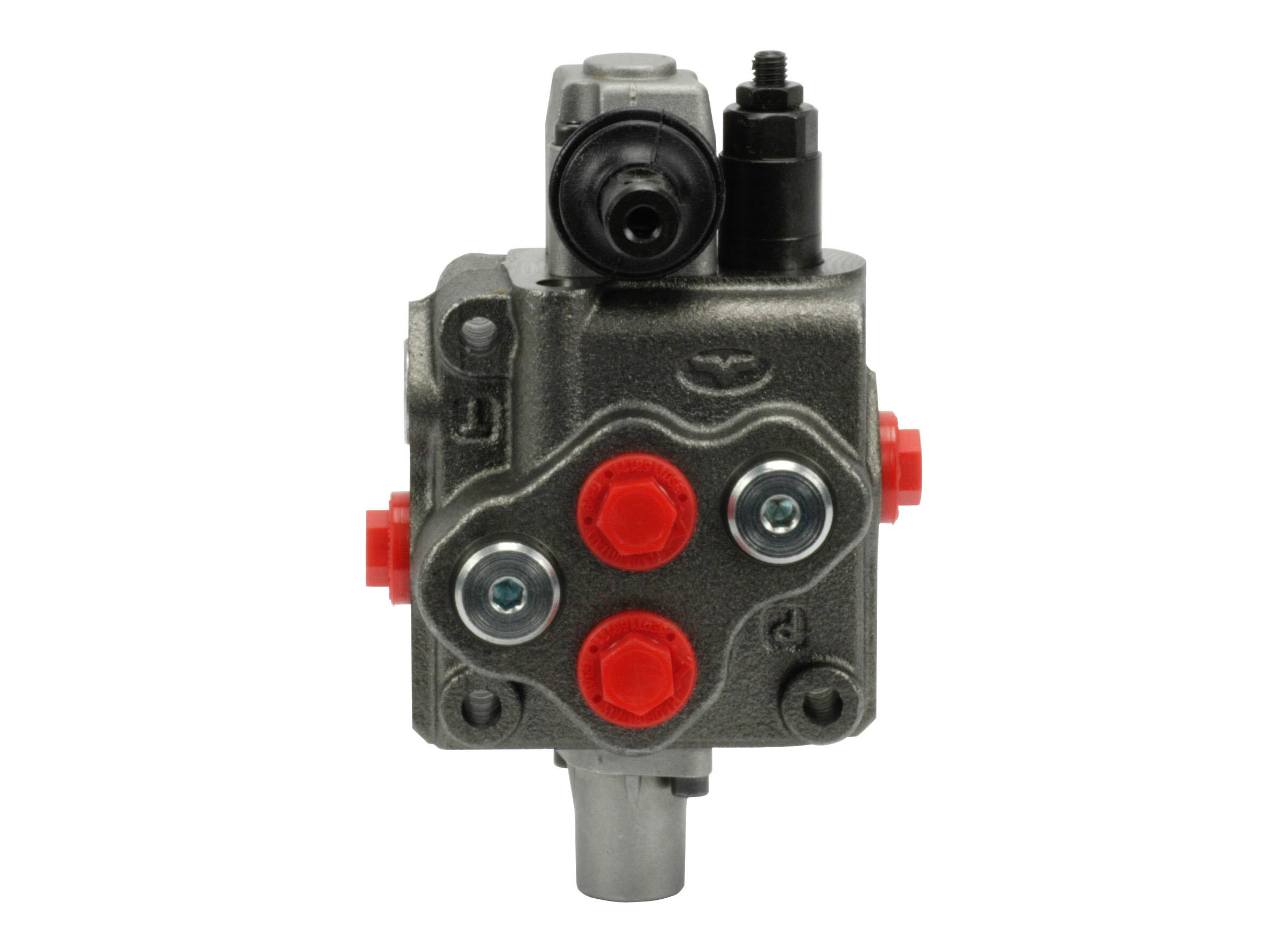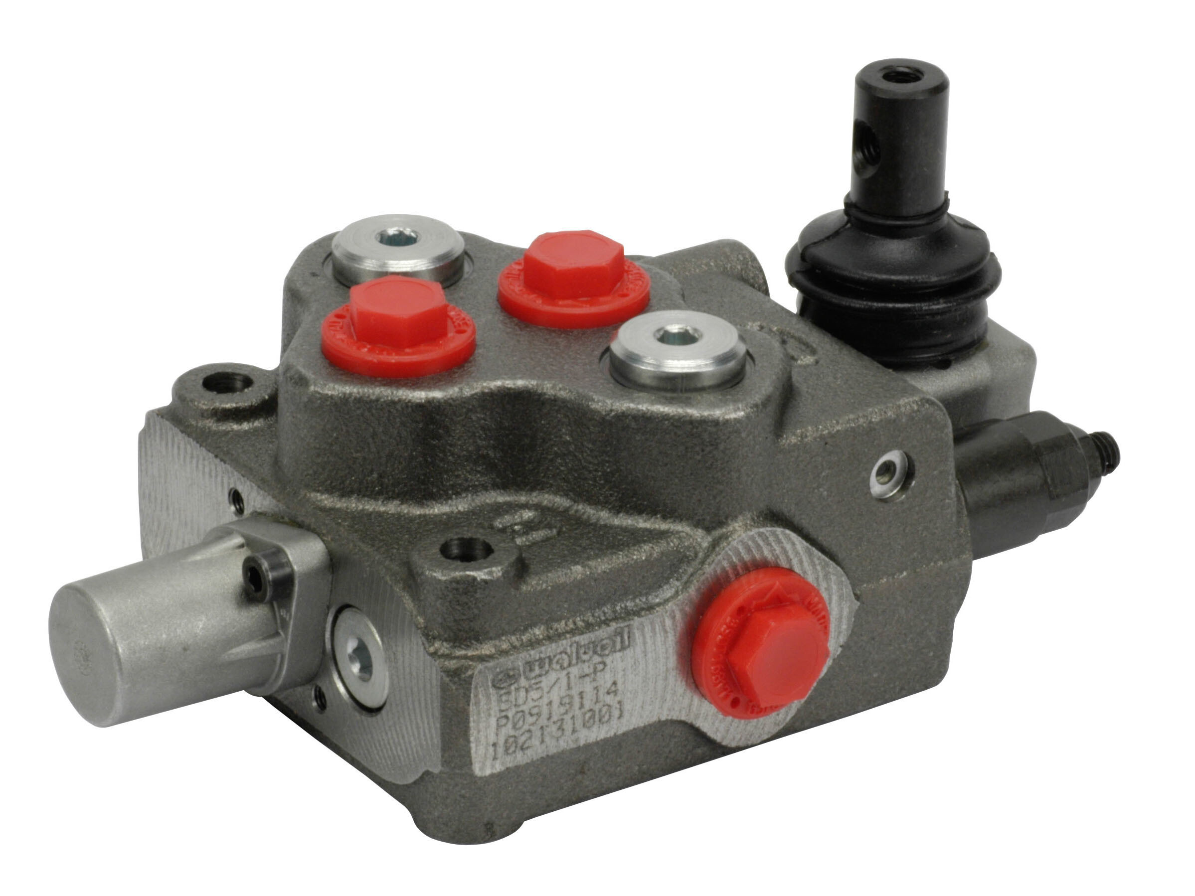 1-sektions SD5 monoblok retningsventil med indbygget trykbegrænsningsventil og een glider. Manuelt aktiveret med håndtag.
