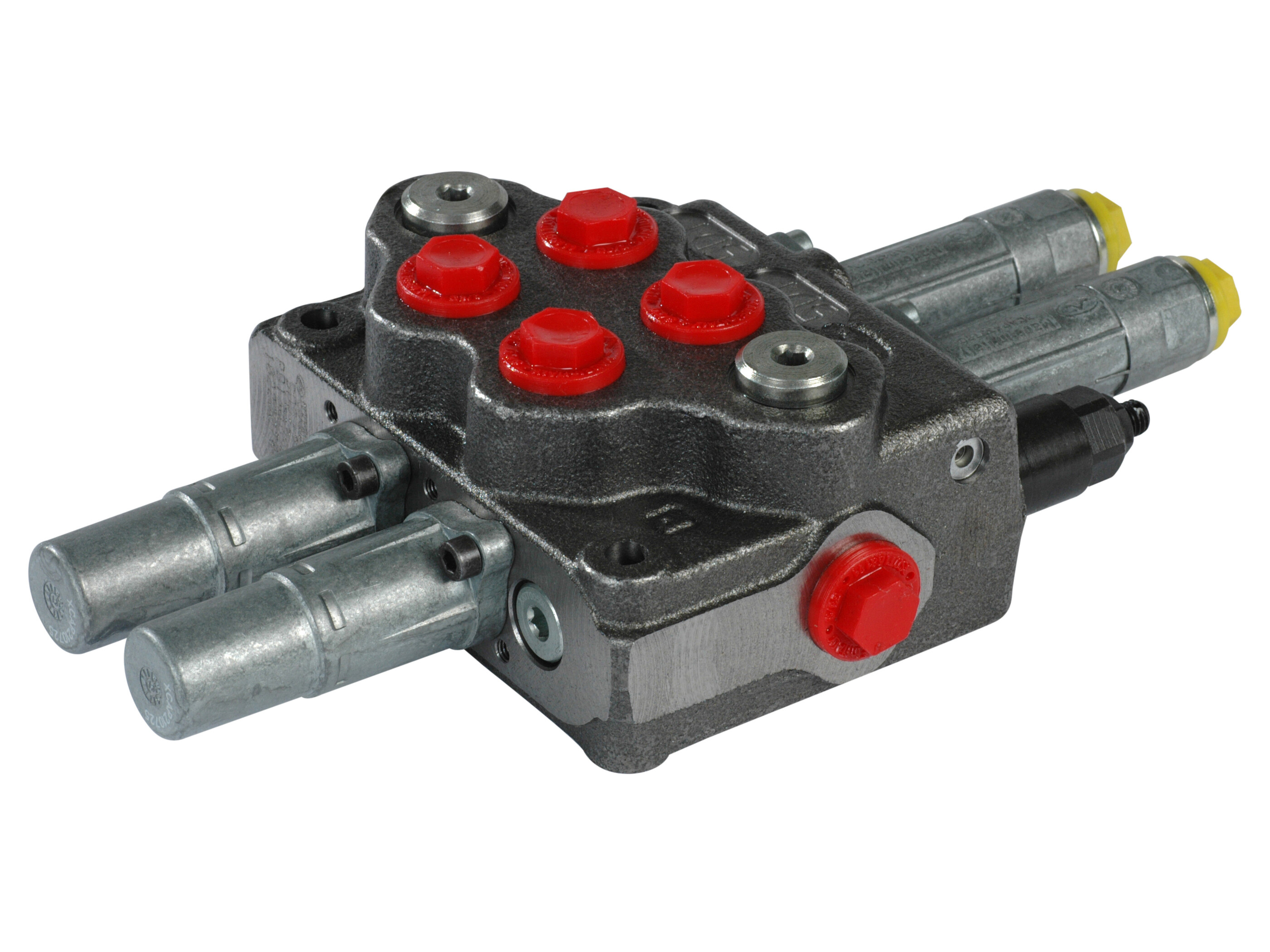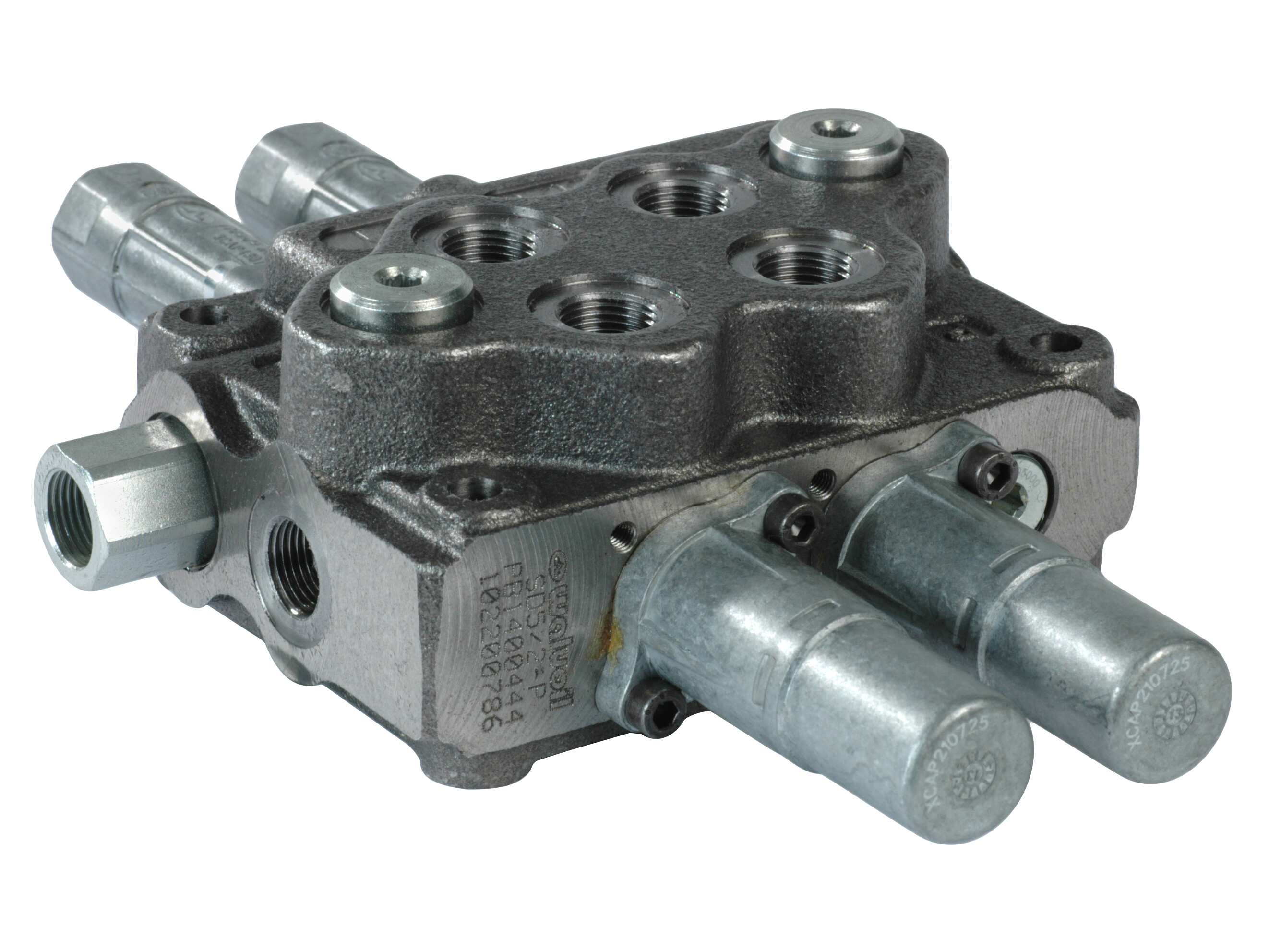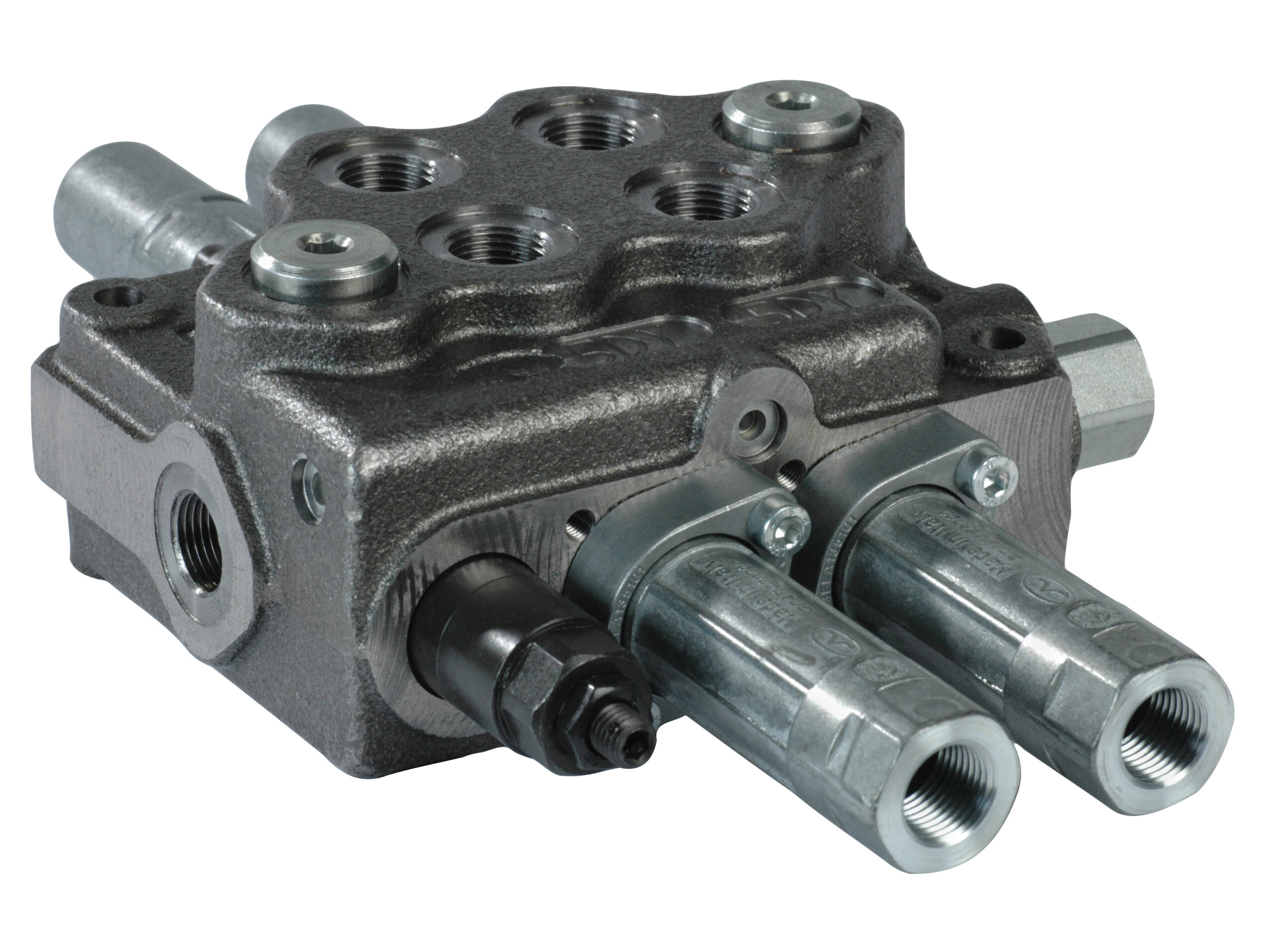 2-sektions SD5 monoblokventil med indbygget trykbegrænsningsventil og 2 parallelforbundne glidere. Manuelt aktiverede med kabel.