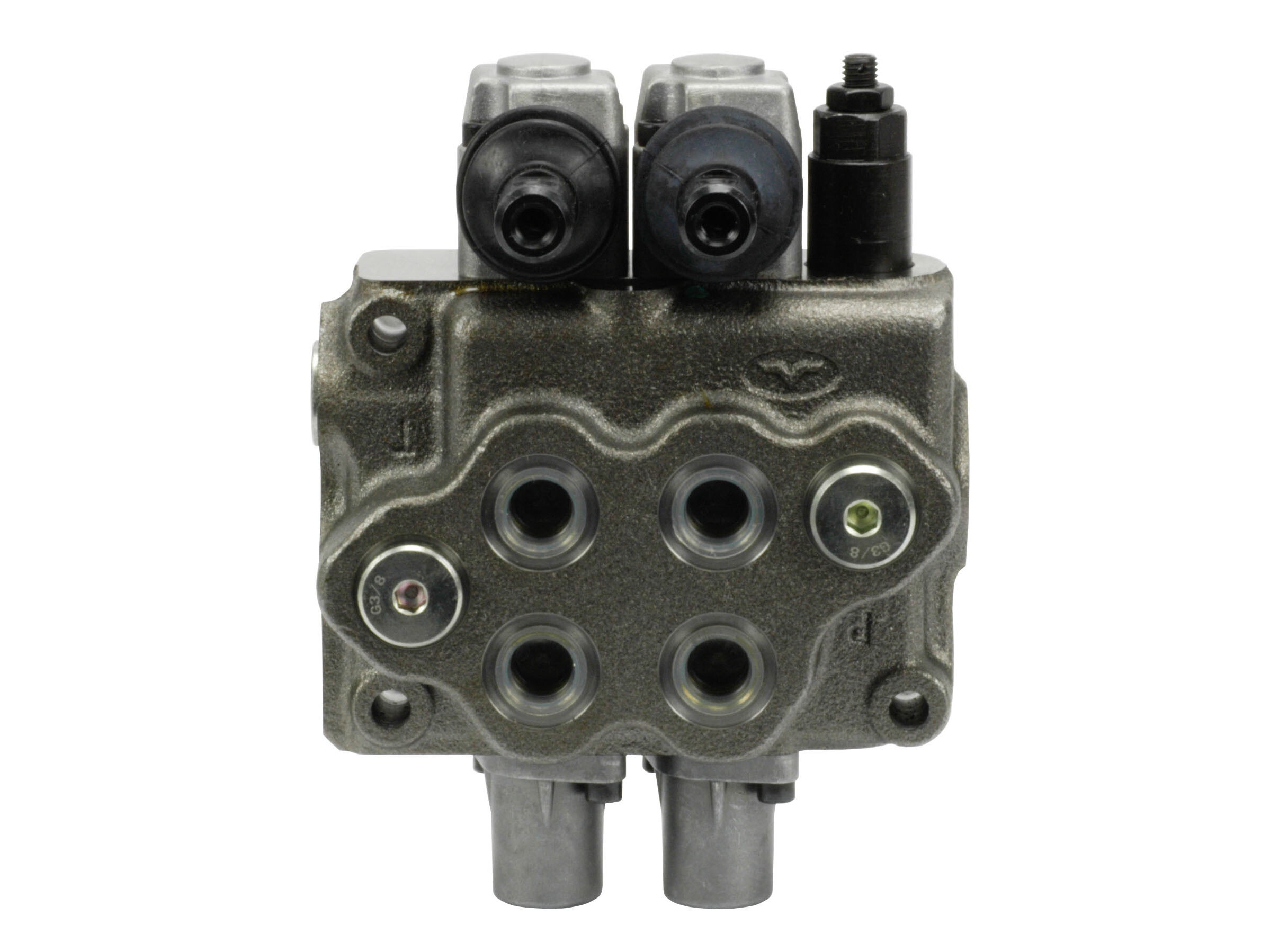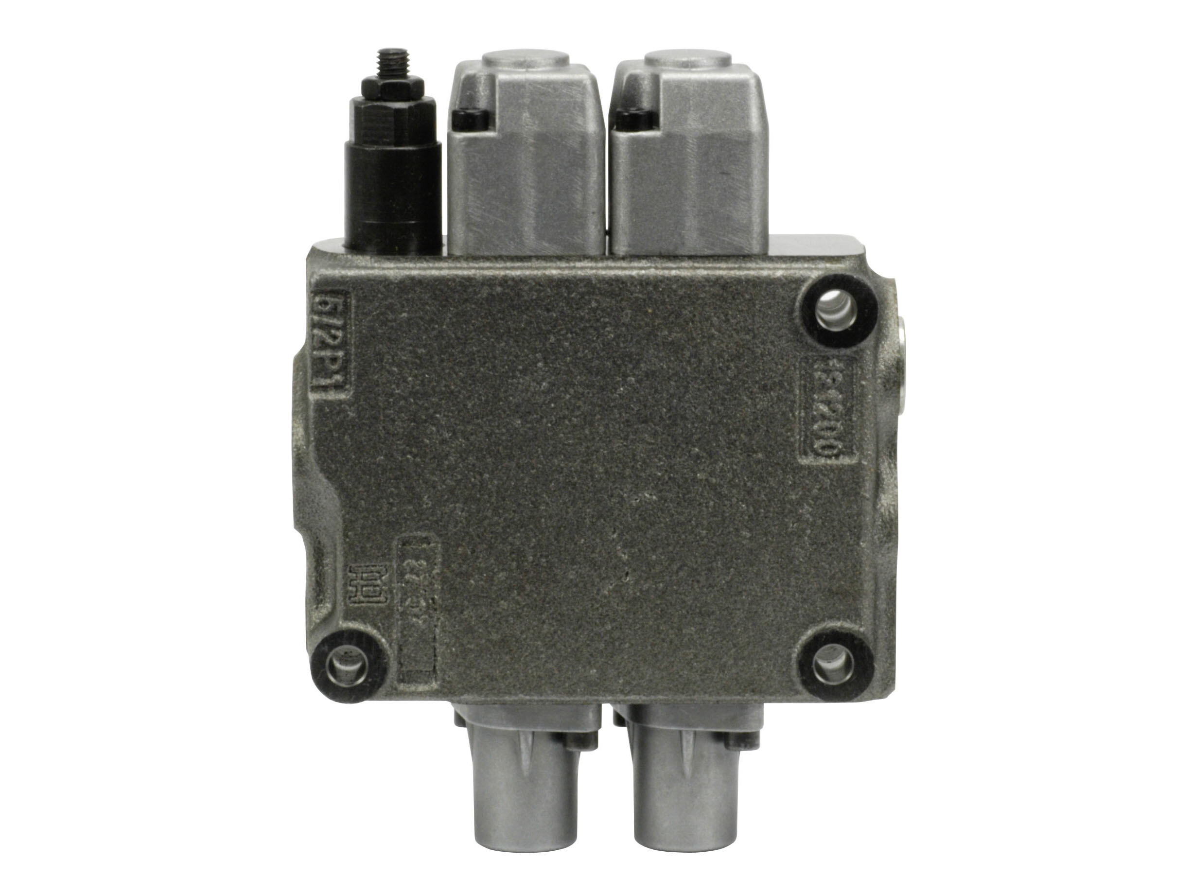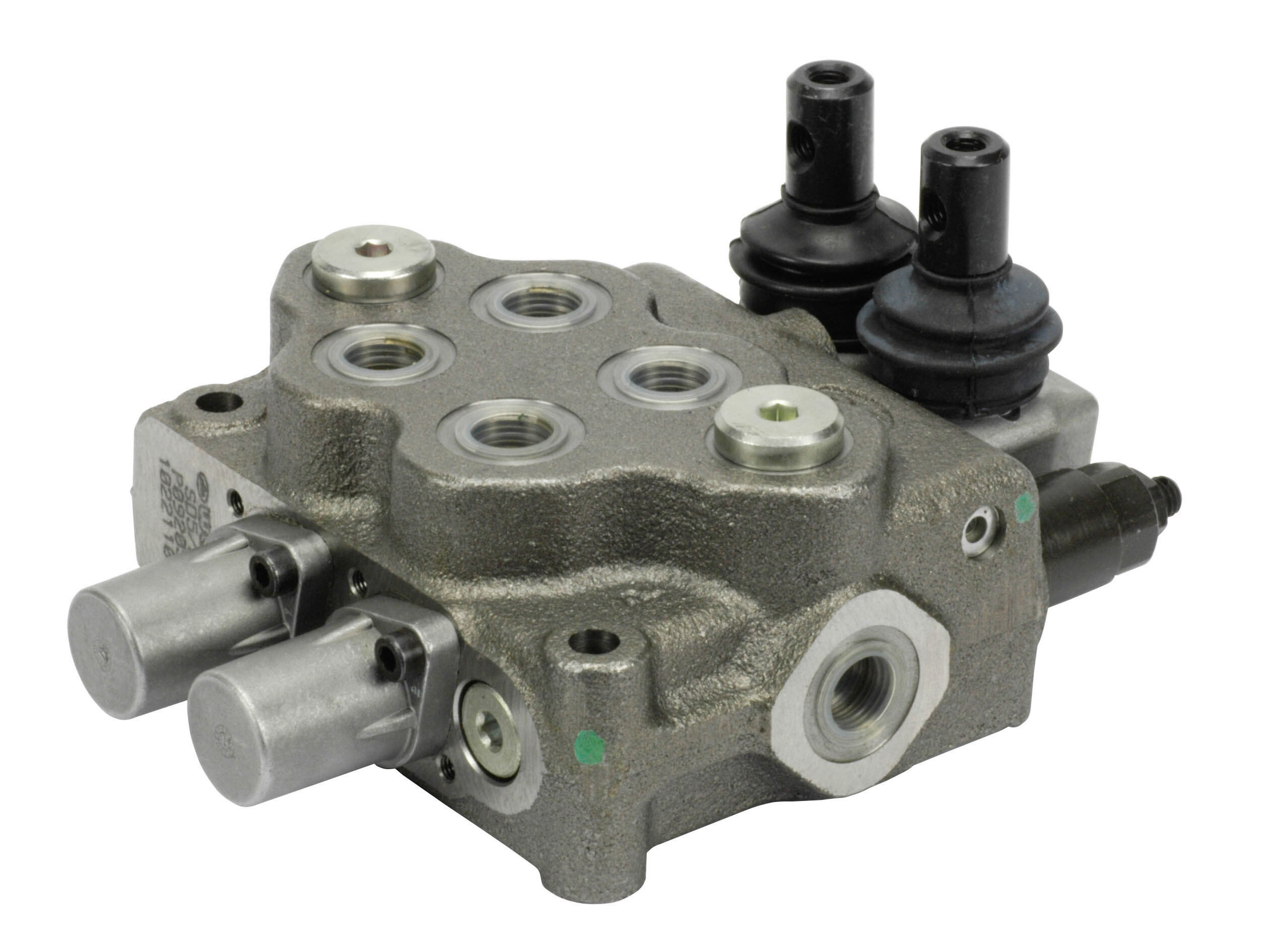 2-sektions SD5 monoblokventil med indbygget trykbegrænsningsventil og 2 parallelforbundne glidere. Manuelt aktiverede med håndtag.