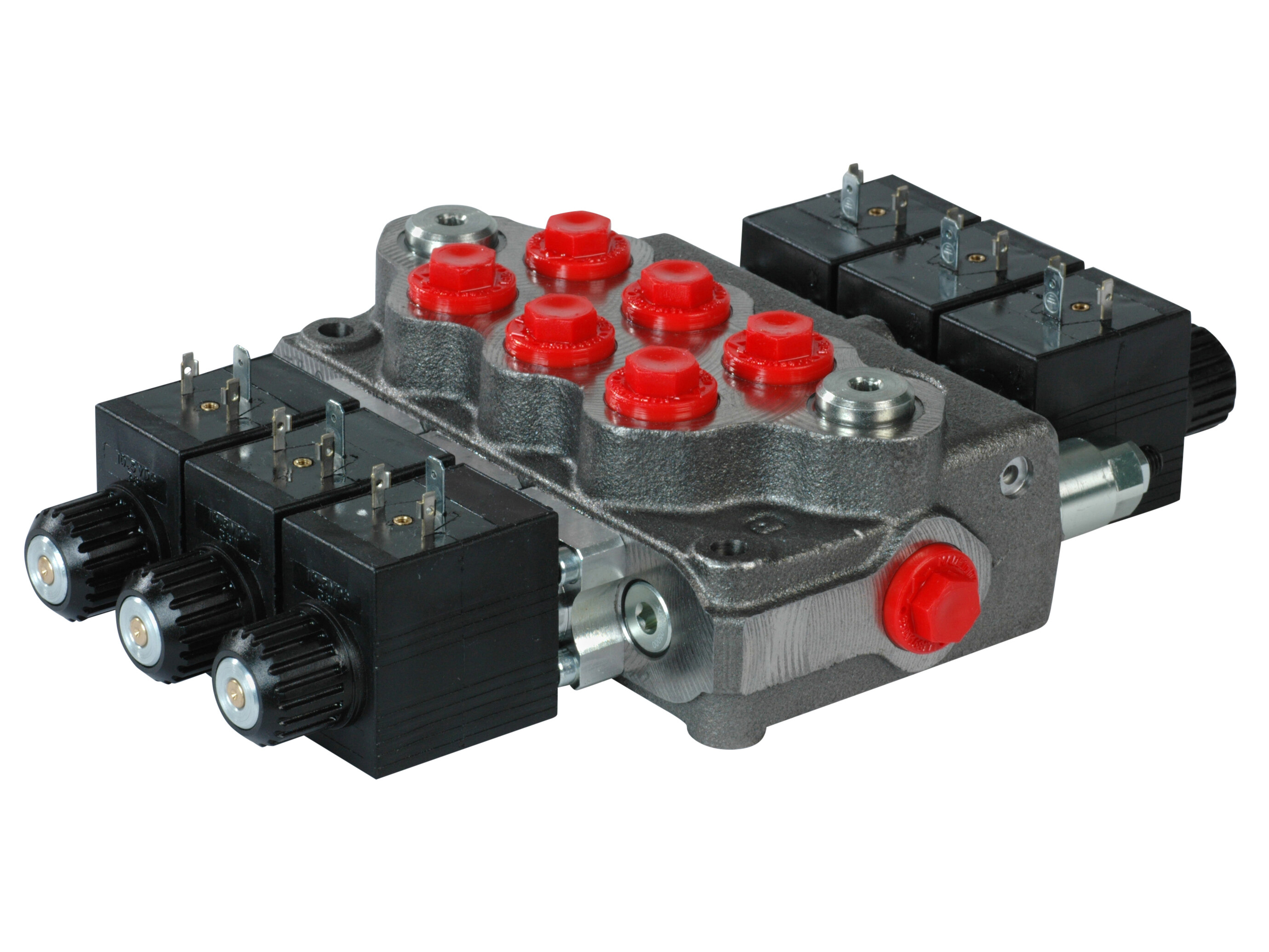 3-sektions SD5 monoblokventil med indbygget trykbegrænsningsventil og 3 parallelforbundne glidere. Elektrisk (12V) aktivering.