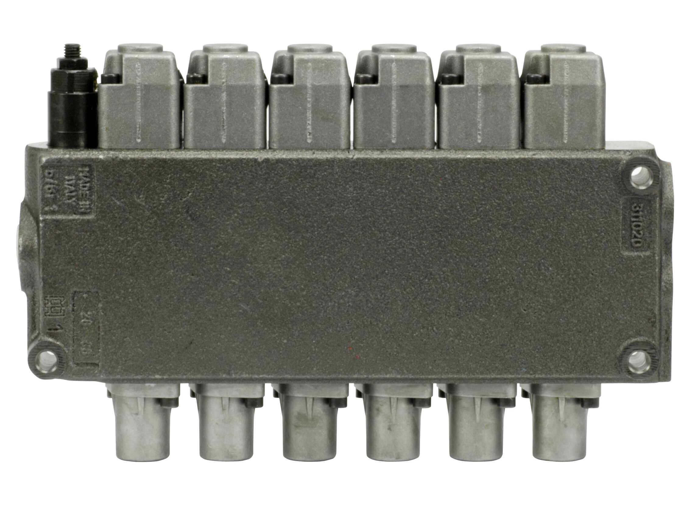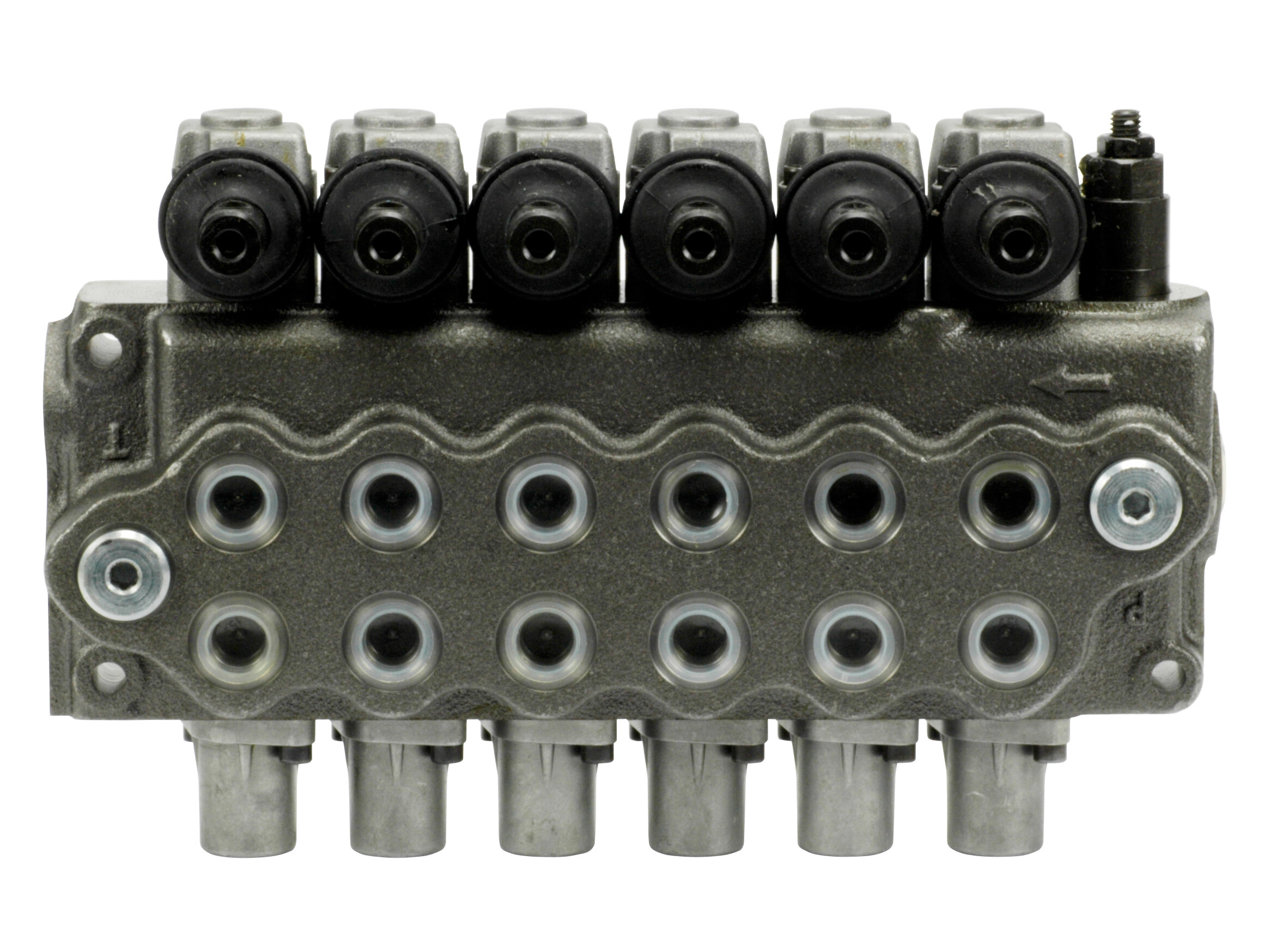 6-sektions SD5 monoblok retningsventil med indbygget trykbegrænsningsventil og 6 parallelforbundne glidere. Manuelt aktiverede med håndtag.