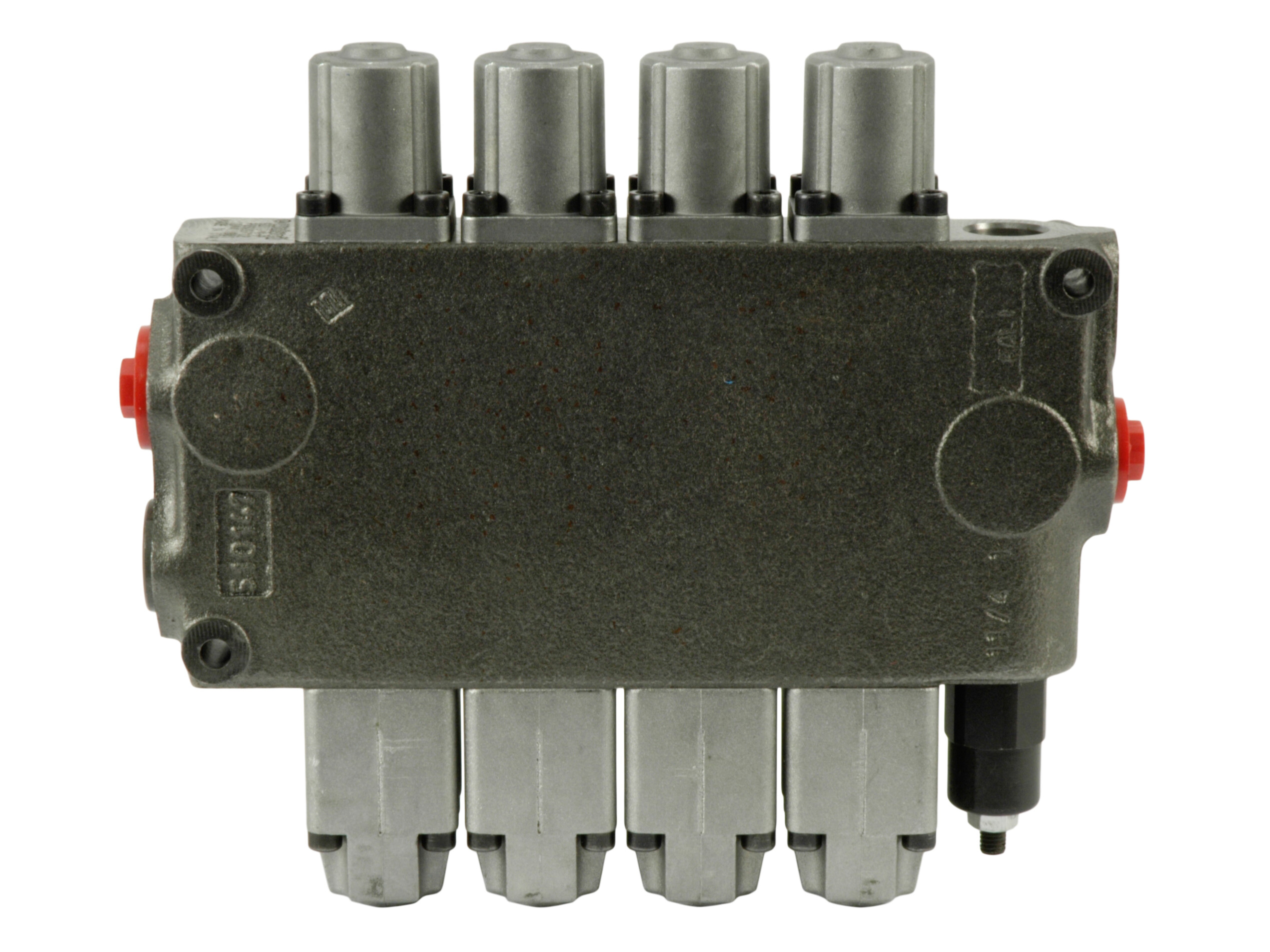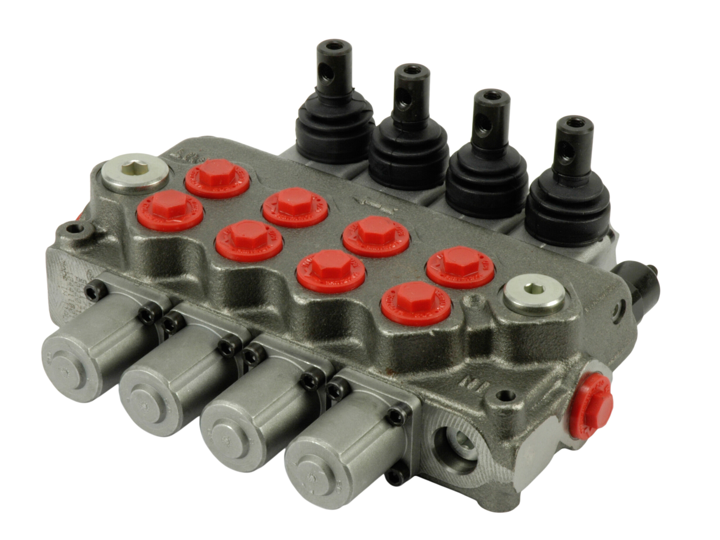 4-sektions SD11 monoblok retningsventil med indbygget trykbegrænsningsventil og 4 parallelforbundne glidere. Manuelt aktiverede med håndtag.