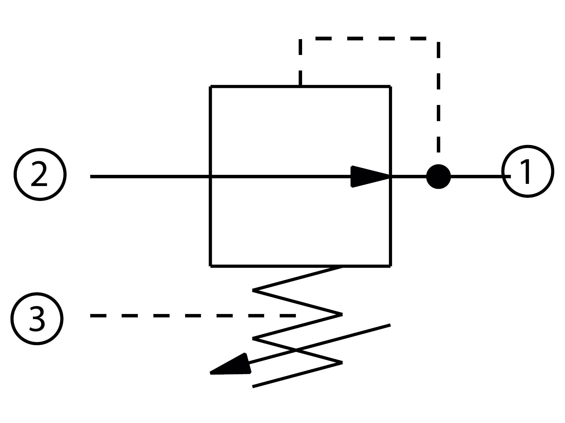 CP230-2, Trykreducerende Ventil, Ikke-aflastende, Direkte virkende Dette er en normalt åben, direkte virkende trykreducerende ventil. Port 2 er åben til port 1, indtil indstillingen er nået, hvorefter ventilen drosler udløbs flowet for at begrænse trykket. Port 3 er kun en afløbsport, da ventilen ikke indeholder en aflastningsfunktion. Denne ventil er ideel til stabil og præcis kontrol af et sekundært tryk i et kredsløb.