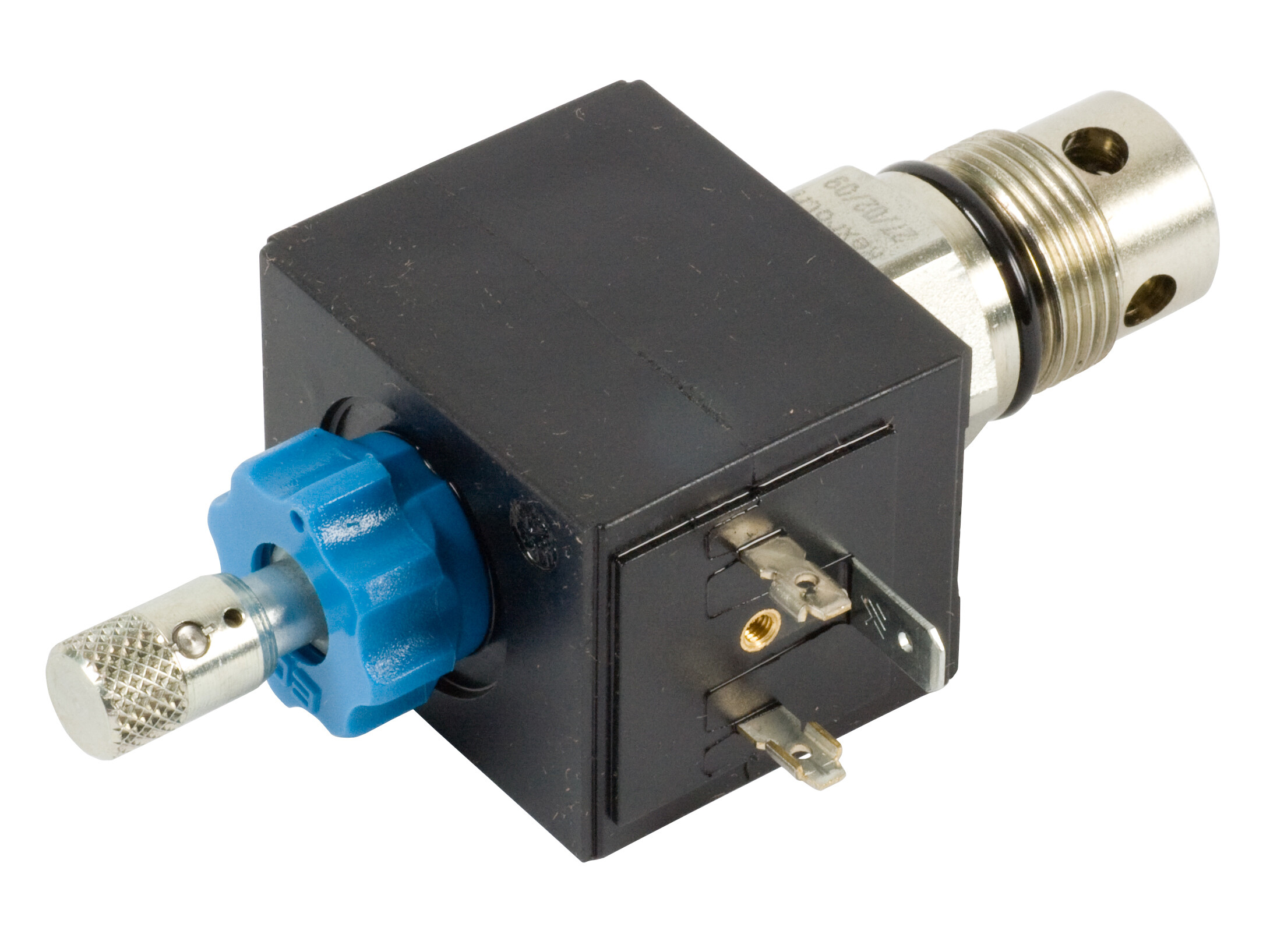 Elektrisk trykaflasteventil til montering i SD6 indgangsmodul. NC - normalt lukket. Aflaster trykket til tank ved spænding på magnetspolen. Med manuel overstyring med lås ("push & twist").