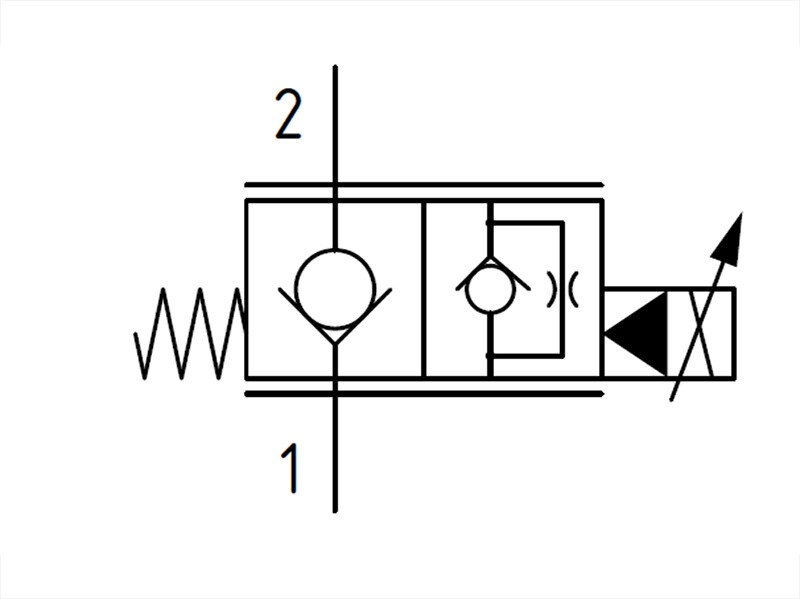Dette er en 2-vejs, poppet-type, normalt lukket, pilotbetjent, ikke-kompenseret proportionalventil. I den ikke-spændingsførte tilstand blokeres flowet fra port 2 til 1, men der er frit flow fra port 1 til 2. Når spolen spændingsføres, vil poppet løftes proportionalt fra sit sæde og åbne port 2 til 1, mens flowet fra port 1 til 2 forbliver begrænset. Når den bruges sammen med en kompenser, vil ventilen fungere som kontrolåbningen for en trykkompenseret flowkontrol.