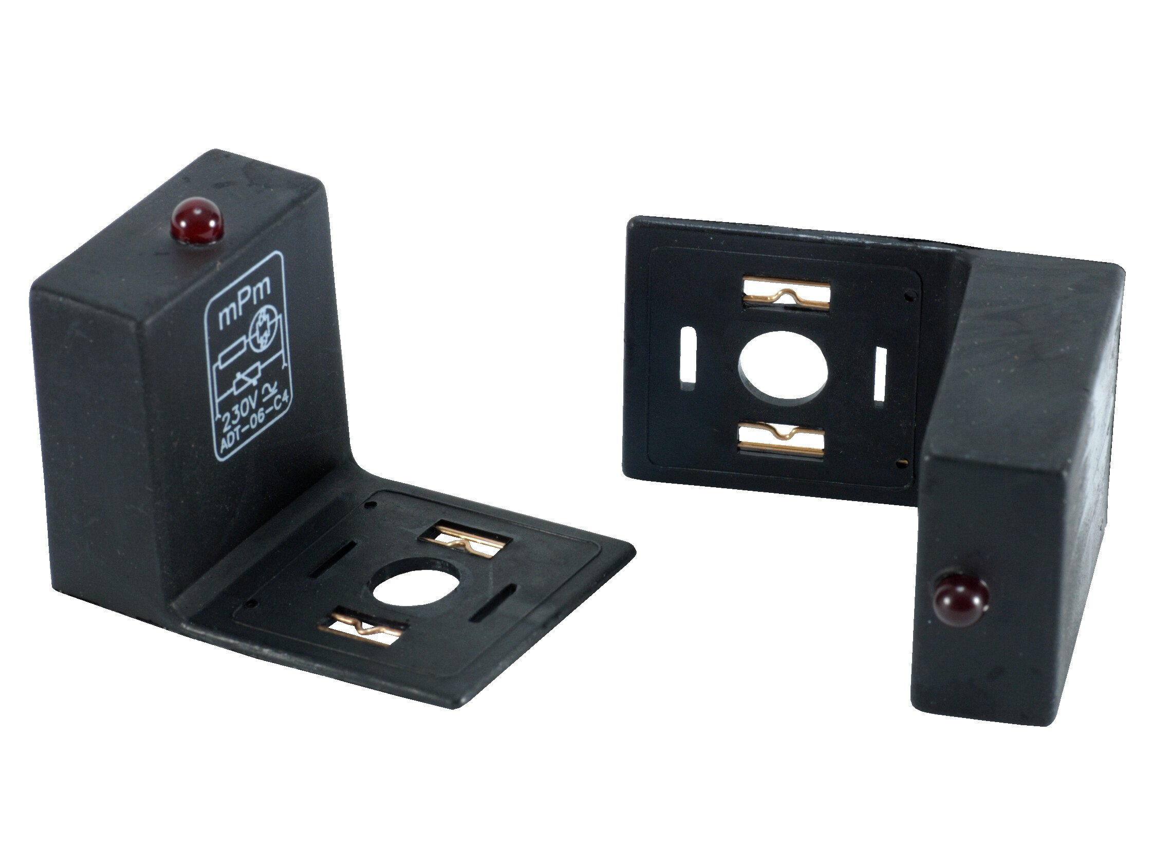 Mellemstik med VDR + lysdiode til montering mellem din-stik og sokkel (magnetspole). Både til AC og DC. Bipolar LED-signal.