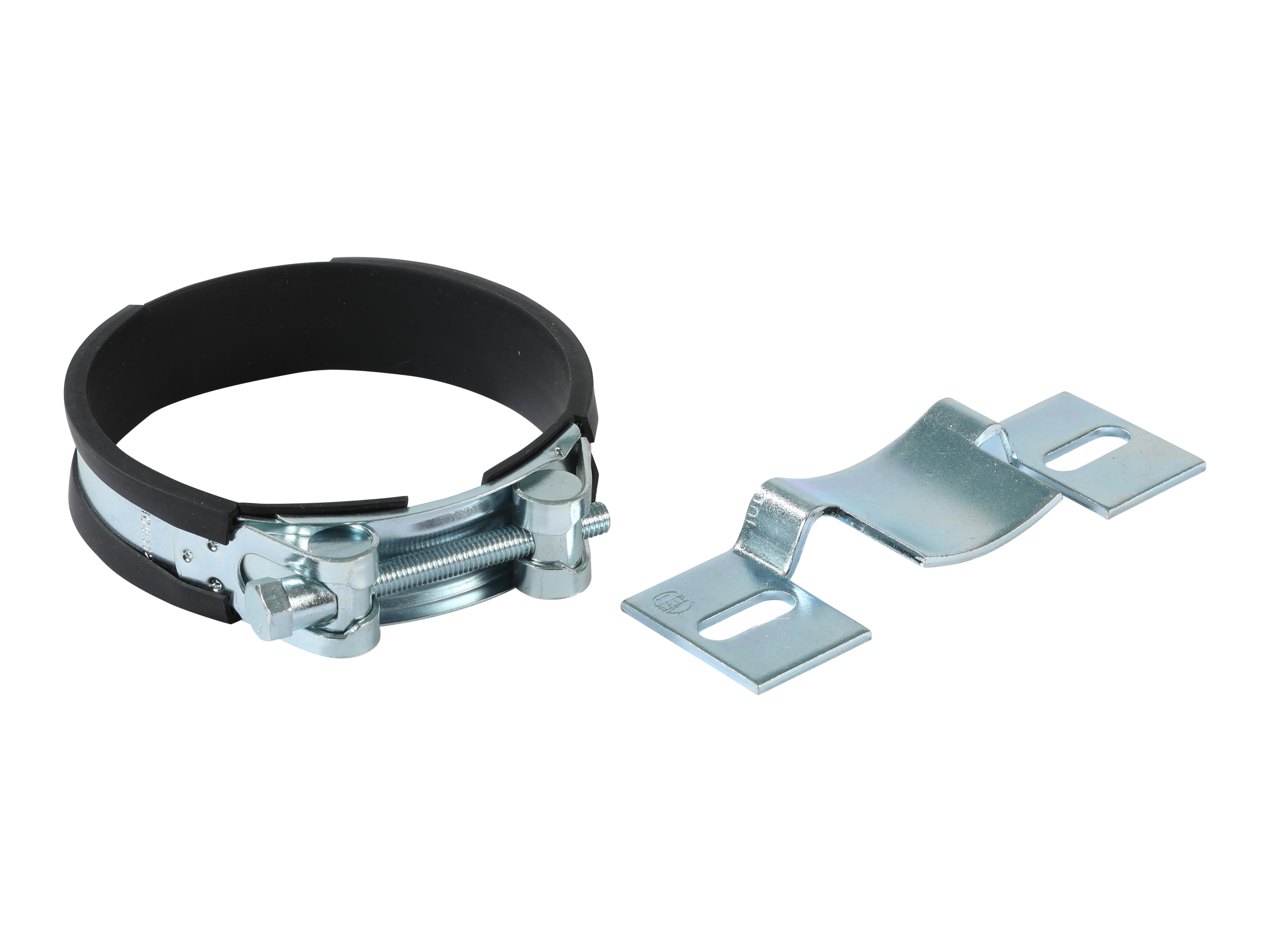 To-delte akkumulatorbeslag med gummiindsats. Bruges til fastgørelse af akkumulatorer i hydrauliske systemer.