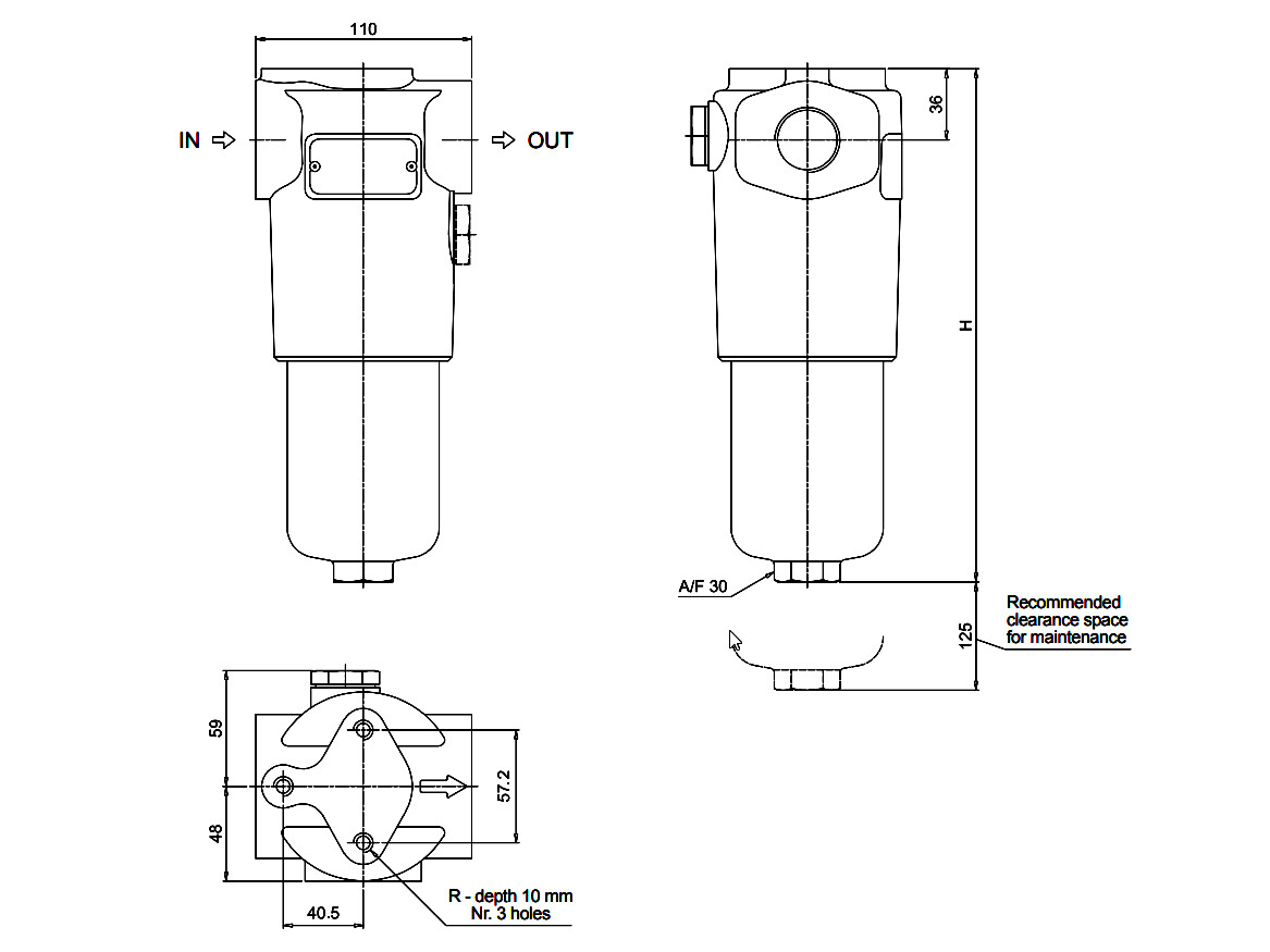 Arbejdshøjde = nødvendig frihøjde under filteret for udskiftning af element.
