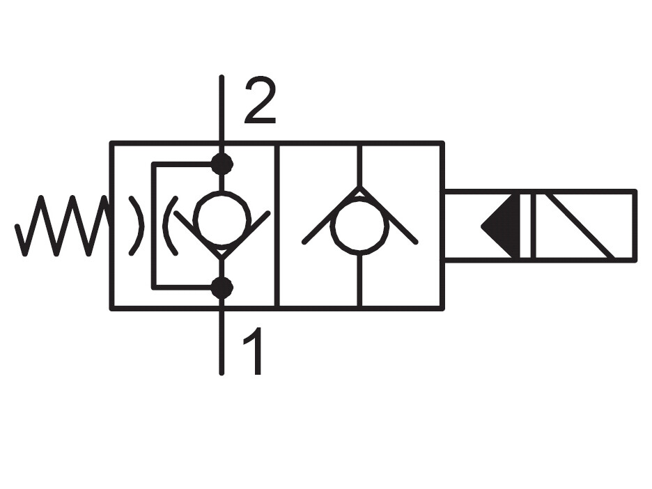 2 position, 2-vejs, normalt åben. Frit flow fra 1 til 2 og begrænset flow fra 2 til 1, når magnetventilen ikke er spændingsført.