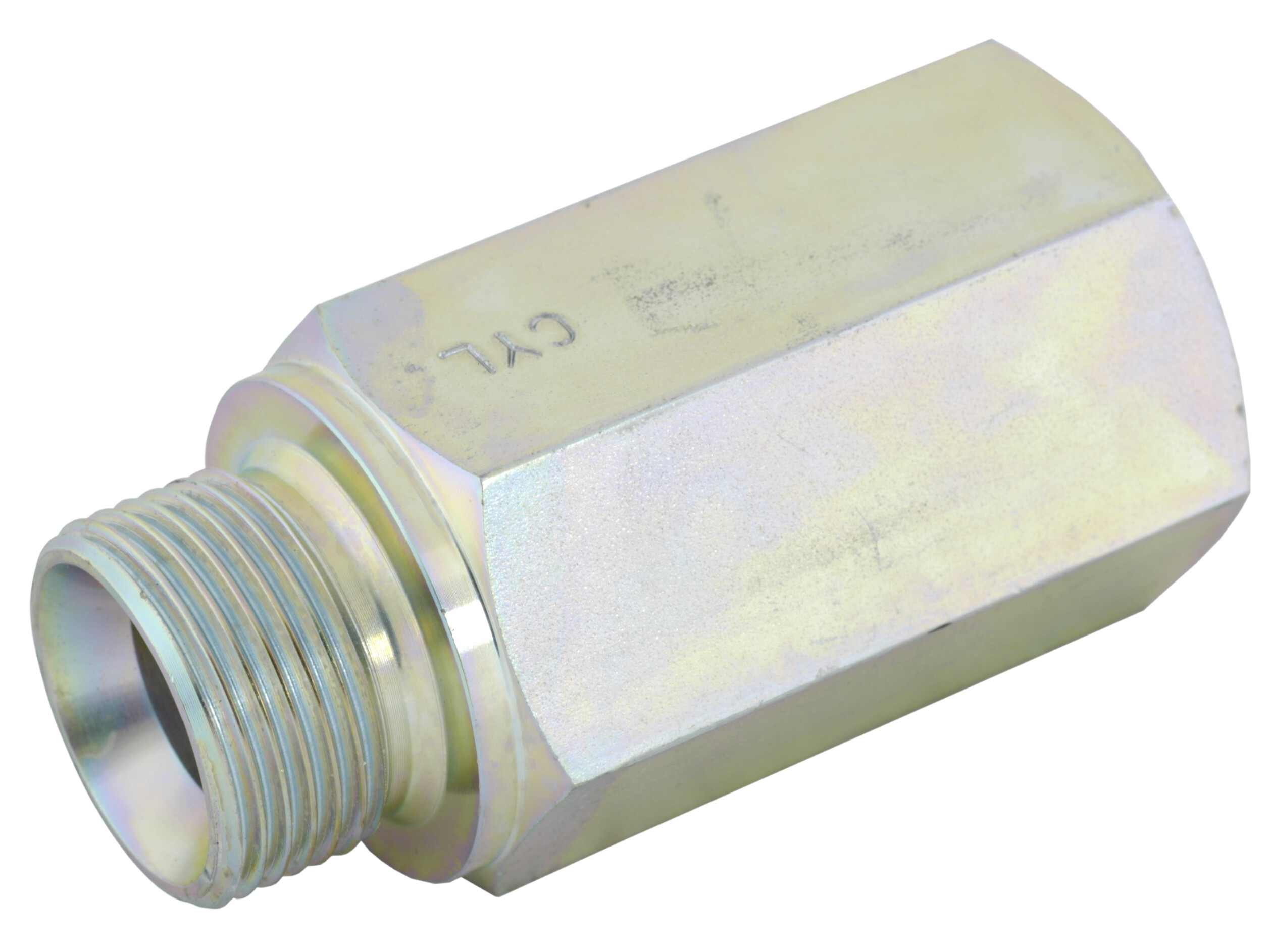 Slangebrudsventil, komplet med hus med udvendigt BSP x indvendigt BSP gevind. Enden med udvendigt gevind skal ved montering vende mod cylinderen.