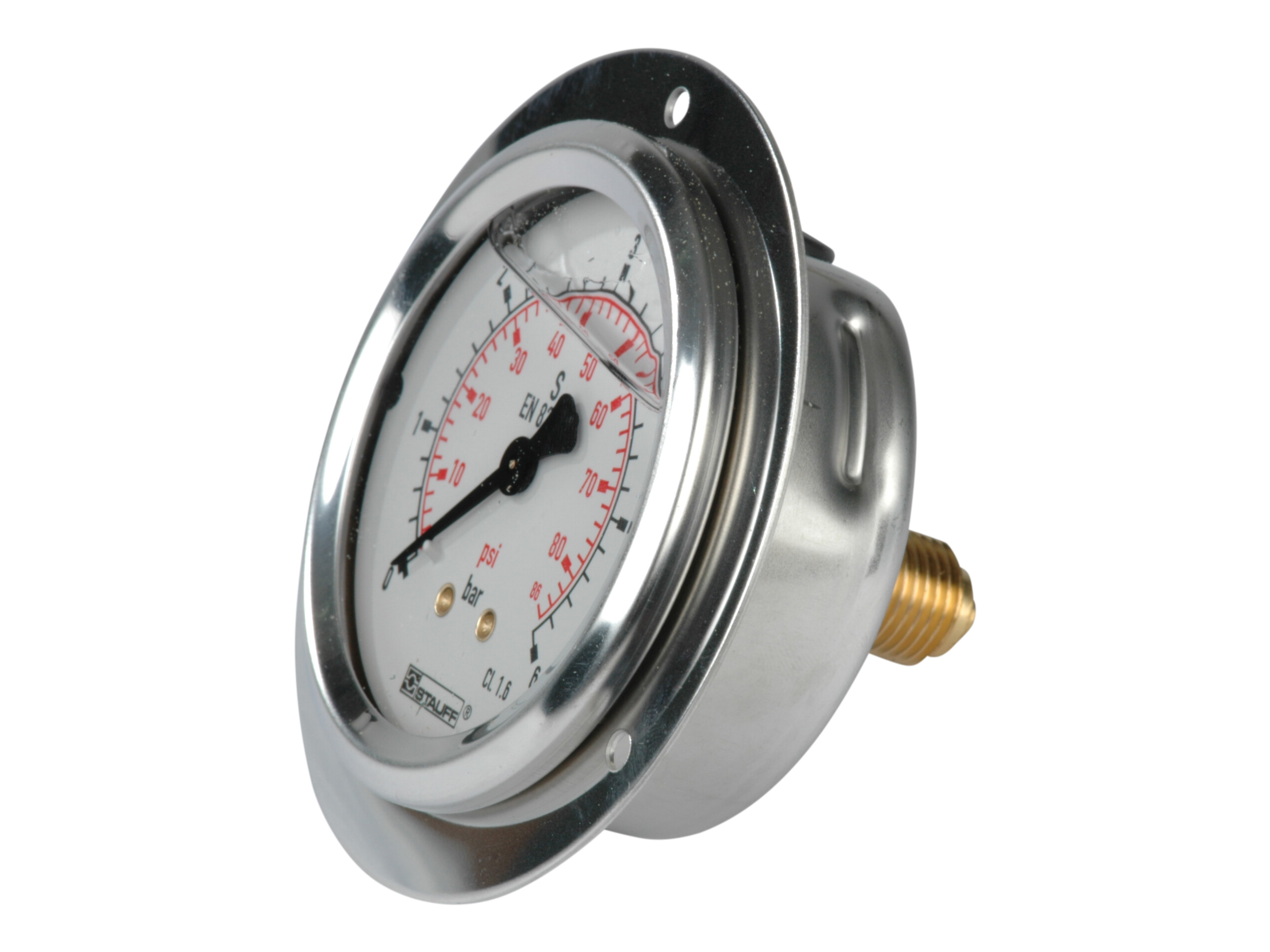1/4" manometer. Studs bagud med frontring. Skala 0-6 bar