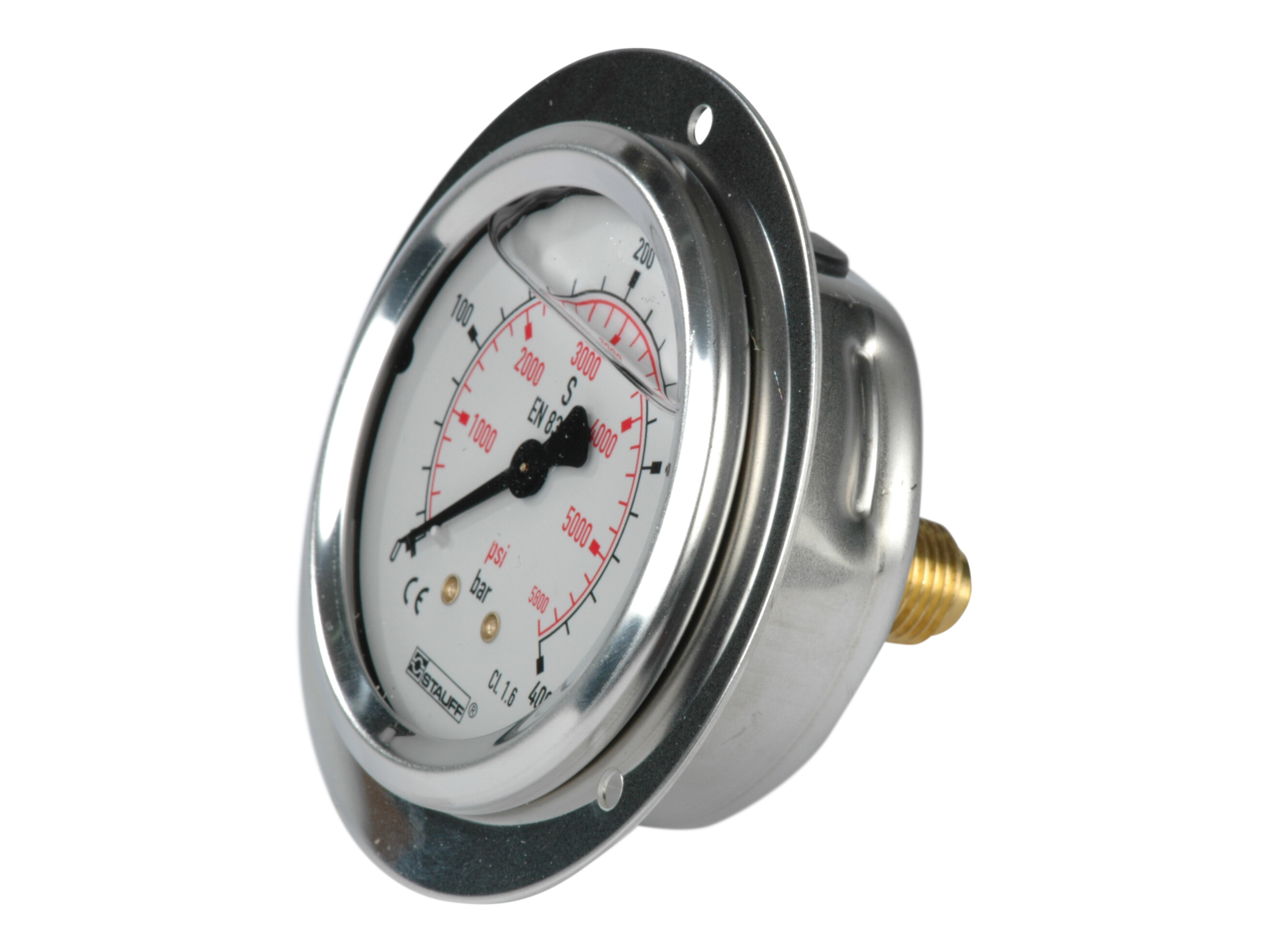 1/4" manometer. Studs bagud med frontring. Skala 0-400 bar