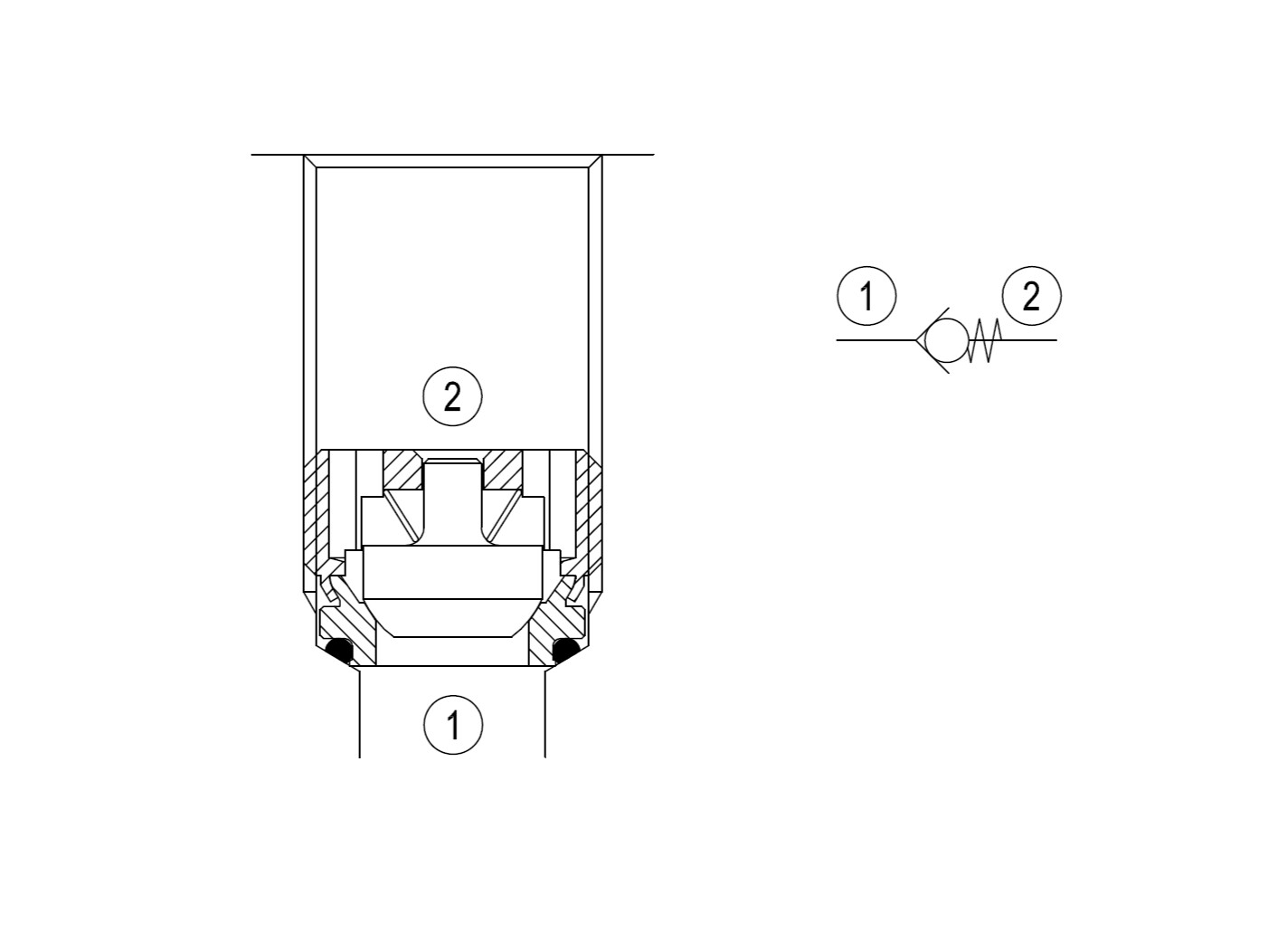 Indsats-kontraventilen sikrer ensretning af flowet og forhindre tilbagestrømning i hydrauliske systemer. Når trykket i 1 stiger til over fjederbelastningstrykket, løftes kuglen og flow tillades fra 1 til 2. Ventilen er lukket fra 2 til 1. Præcisionsbearbejdning og hærdningsprocesser muliggør praktisk talt lækagefri ydeevne i den lukkede tilstand.