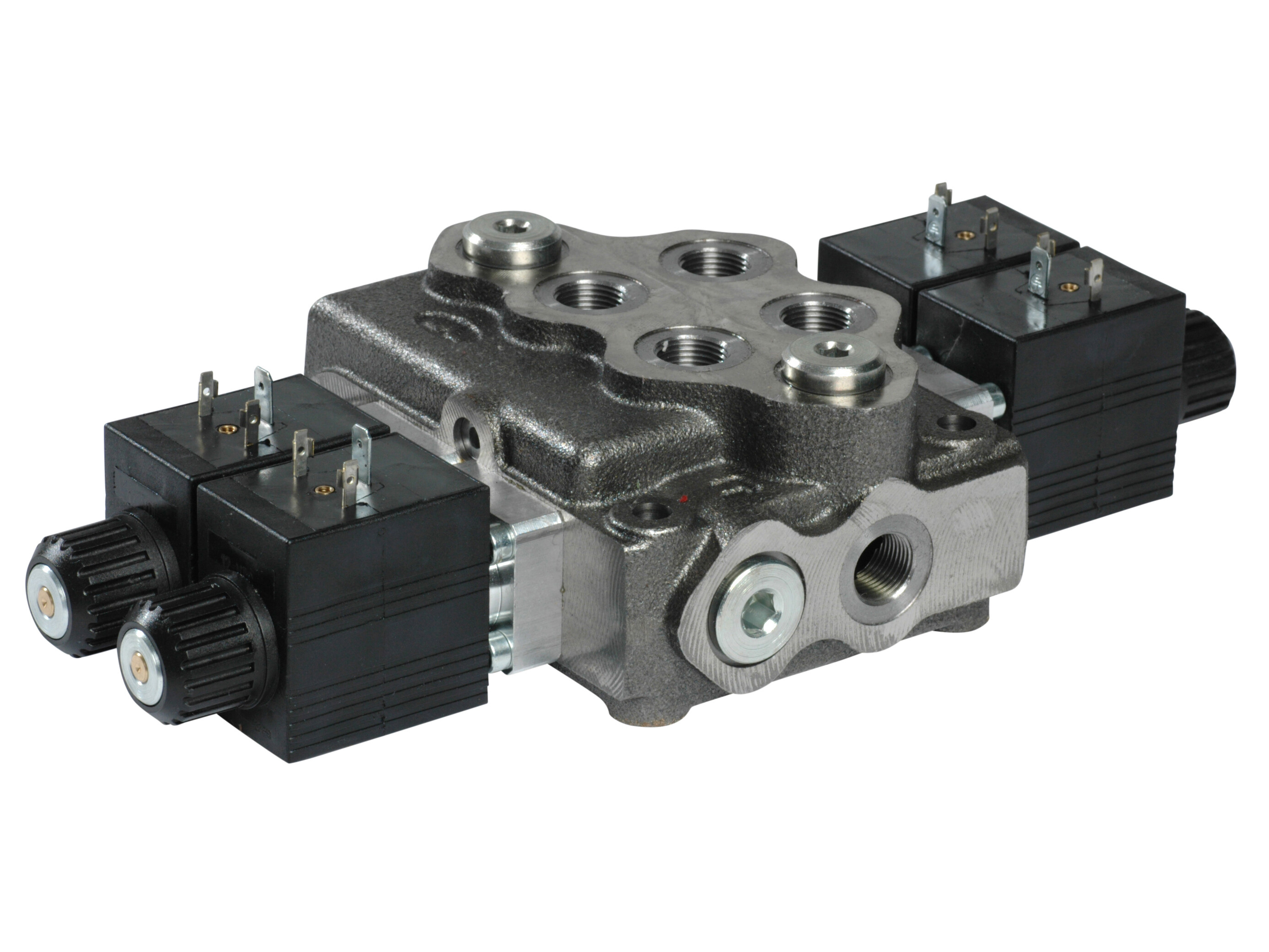 2-section SD5 monoblock valve with built-in pressure relief valve and 2 spools in parallel. Solenoid (12 Vdc) activated.