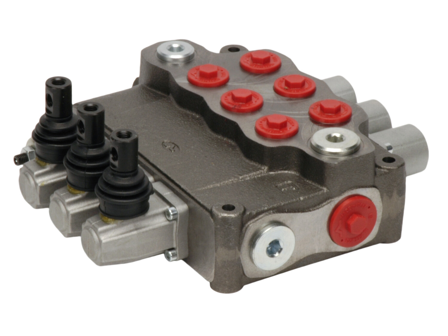 3-section SD18 monoblock directional valve with built-in pressure relief valve and 3 spools. Manually activated with handlevers.
