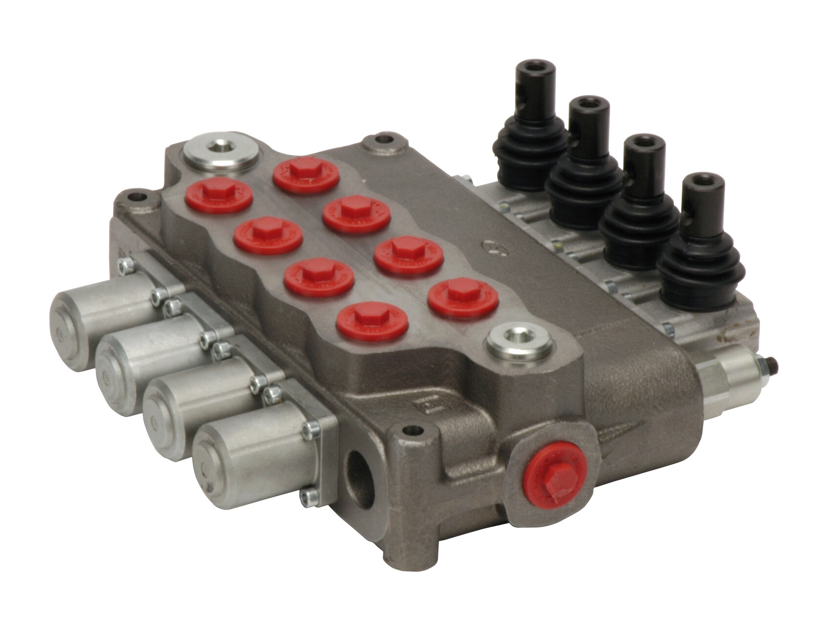 4-section SD18 monoblock directional valve with built-in pressure relief valve and 4 spools in parallel. Manually activated with handlevers.