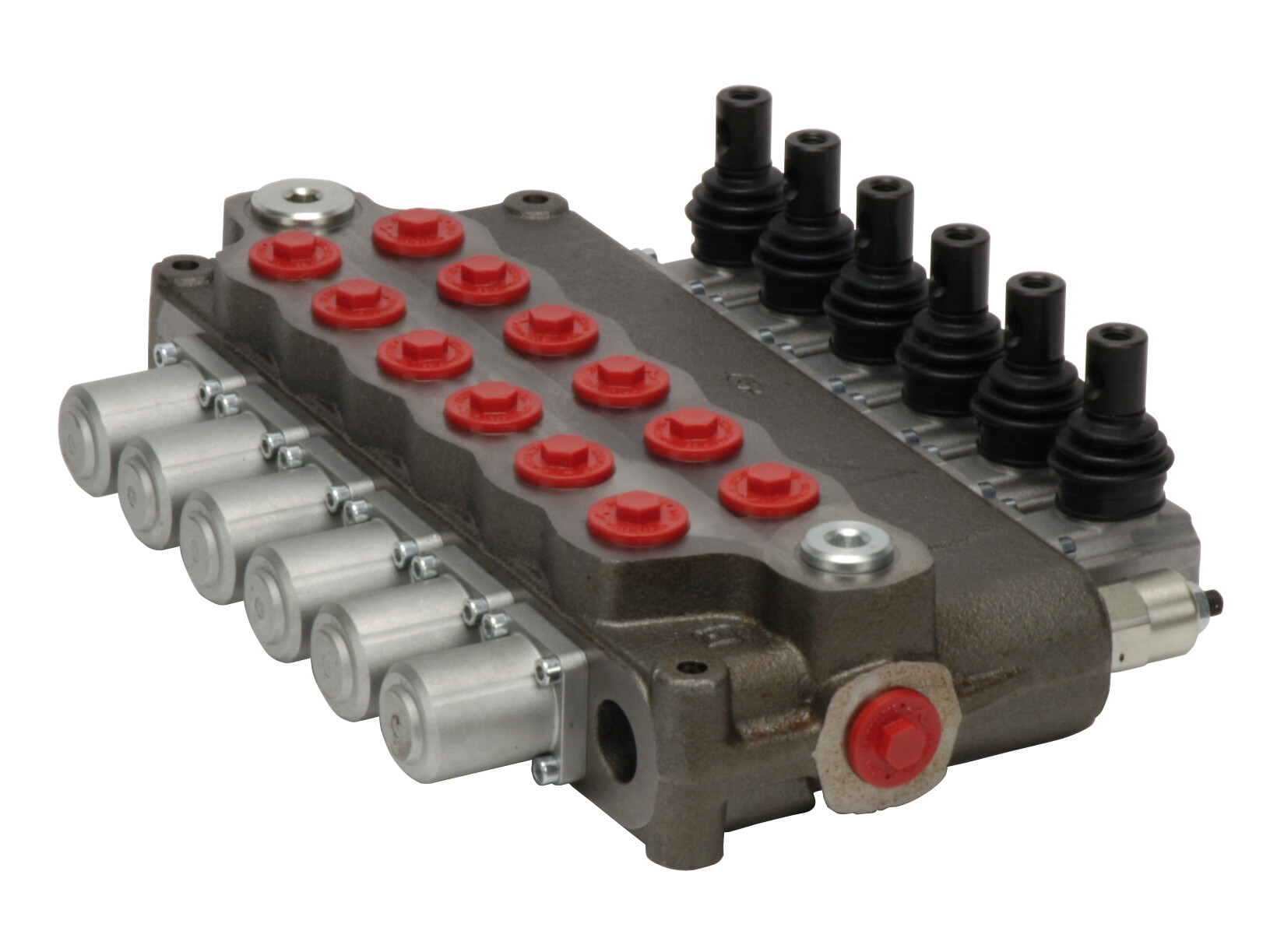 6-section SD18 monoblock directional valve with built-in pressure relief valve and 6 spools in parallel. Manually activated with handlevers.