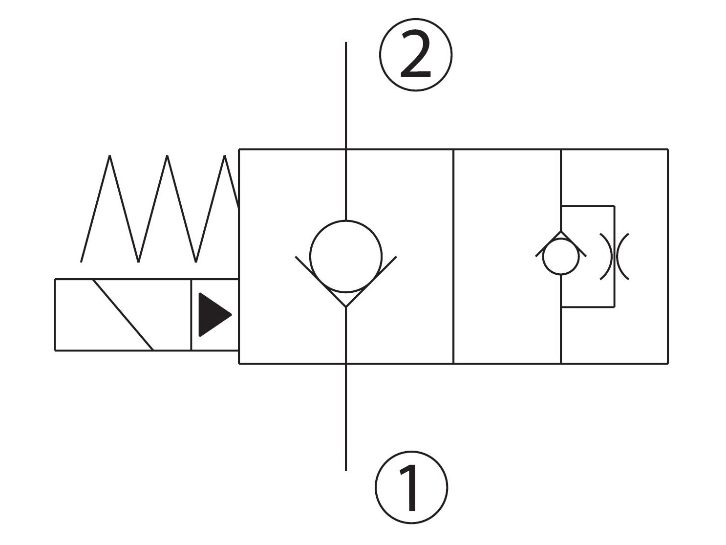 This is a normally closed, pilot-operated, poppet-style 10-size solenoid valve. When de-energized, the HSVP10-NC acts as a check valve allowing flow from port 1 to port 2 and blocking flow from port 2 to port 1. When energized, the valve’s poppet is shifted and allows flow from port 2 to port 1, and severely restricts from port 1 to port 2.