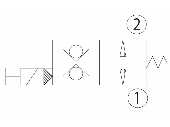 This is a normally open, poppet-style 10-size solenoid valve. When de-energized, the valve allows free flow from 2 to 1 or 1 to 2. When energized, the valve’s poppet is seated, and flow is blocked in both directions.