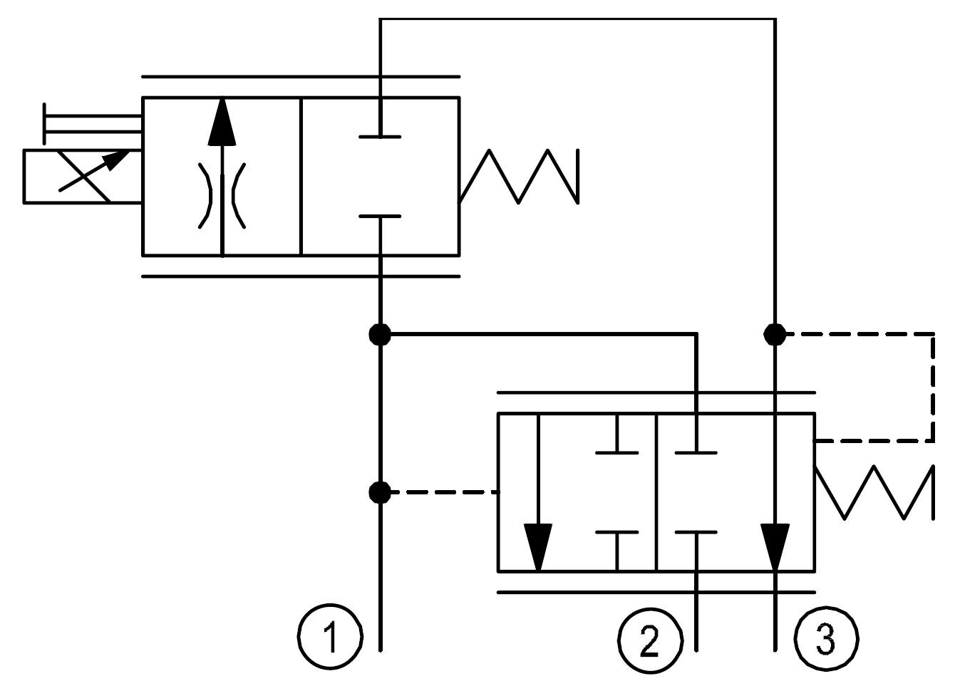 In the de-energized condition, flow is blocked from port 1 to the priority port 3 and all flow passes from port 1 to 2.
