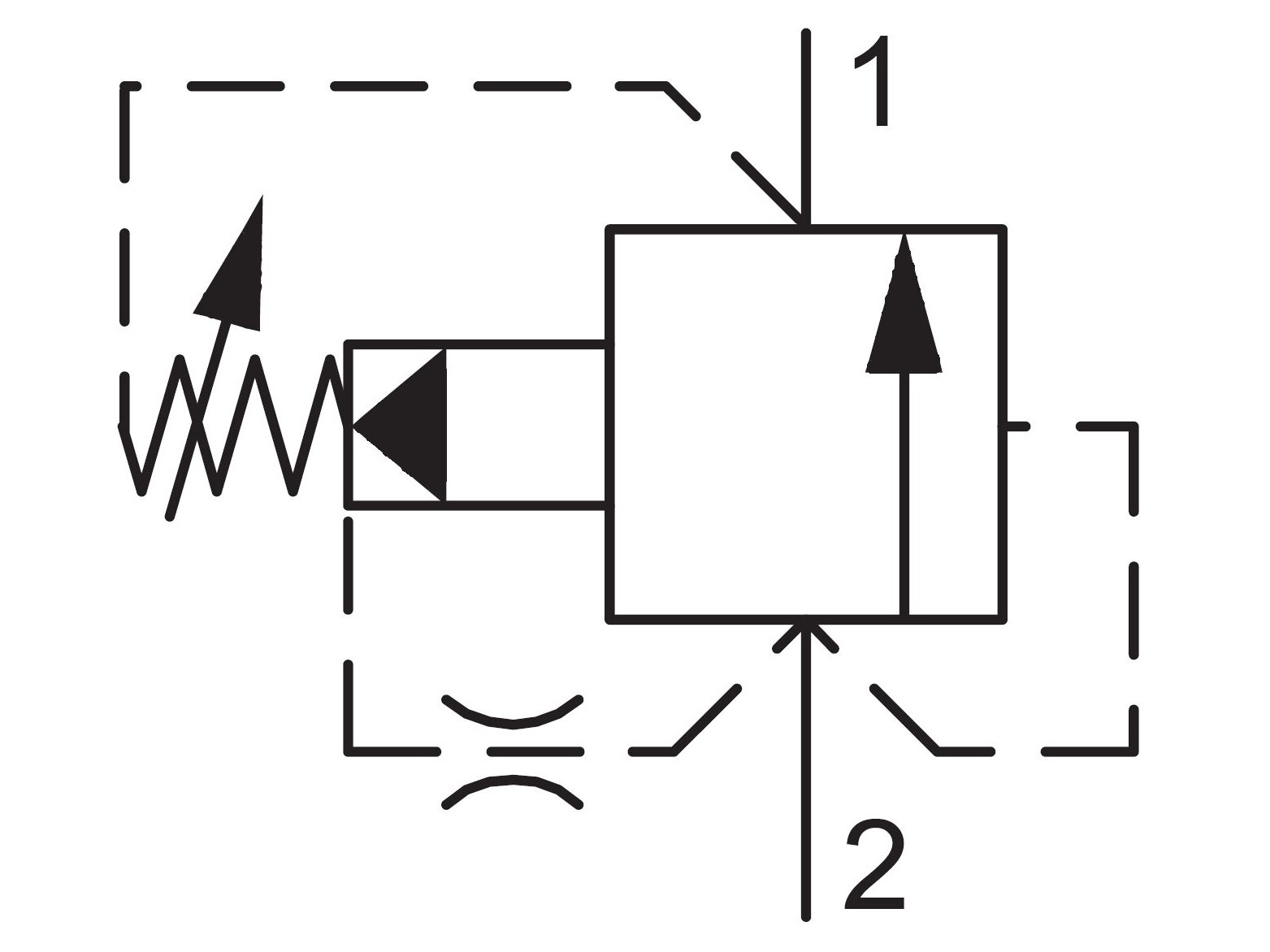 Reverse flow [1] to [2], is blocked. Back pressure on port [1] adds to the valve setting.