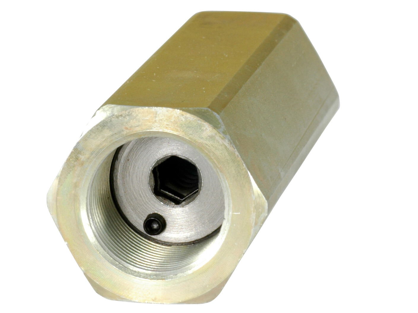 The spring load is adjustable by turning the internal ring nut with a insex wrench: screwing down increases the spring load and increases the cracking pressure (in order to turn the Ring Nut, loosen first the little locking screw with a insex wrench; tighten it again once the spring load is adjusted).