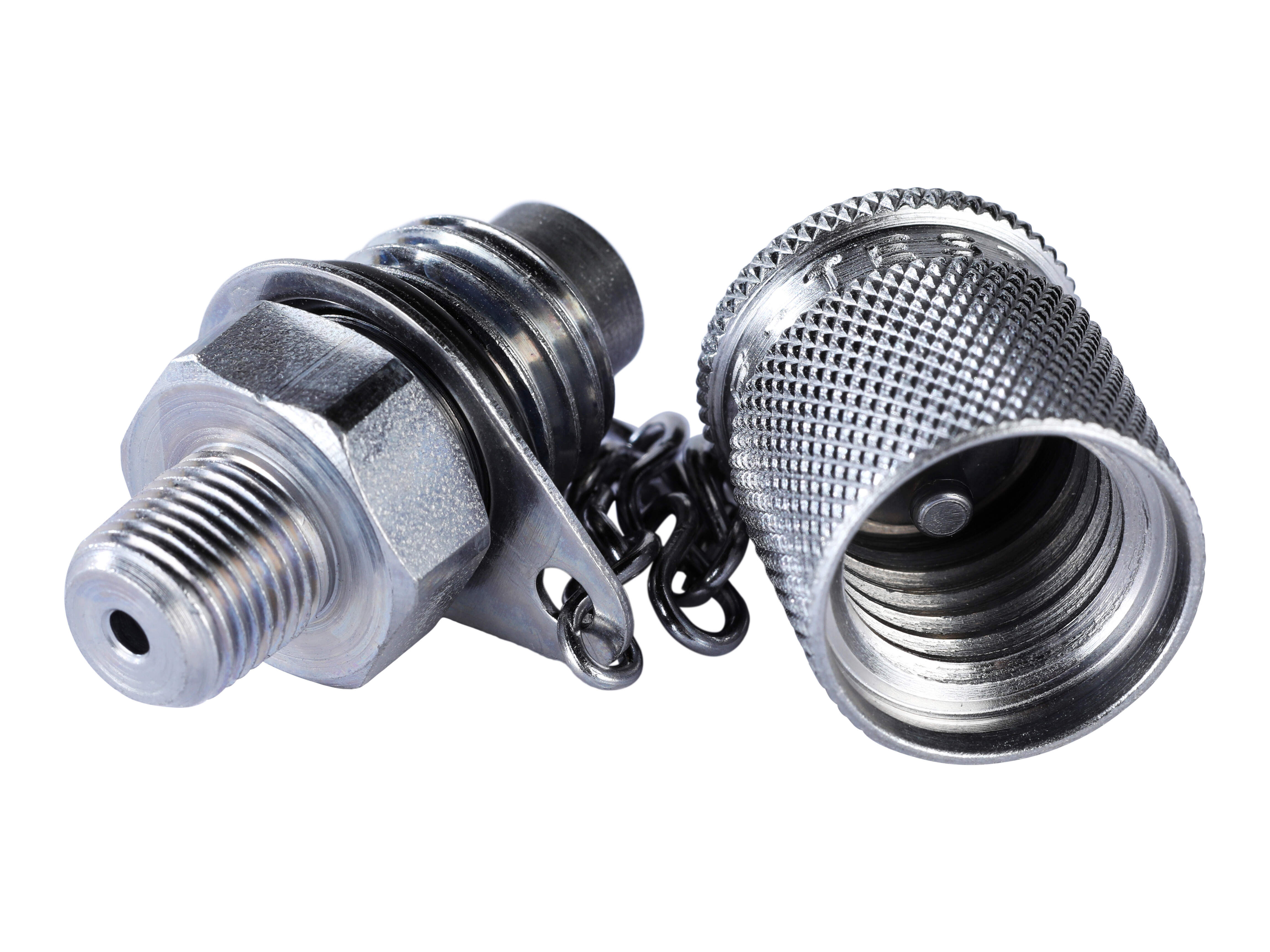Testadaptors with NPT thread for pressure monitoring and venting. Well suited for hydraulic fluids and and other fluids based on mineral oil. Metal protection cap included. Can be connected under pressure without oil spillage. Max connecting pressure: 400 Bar.