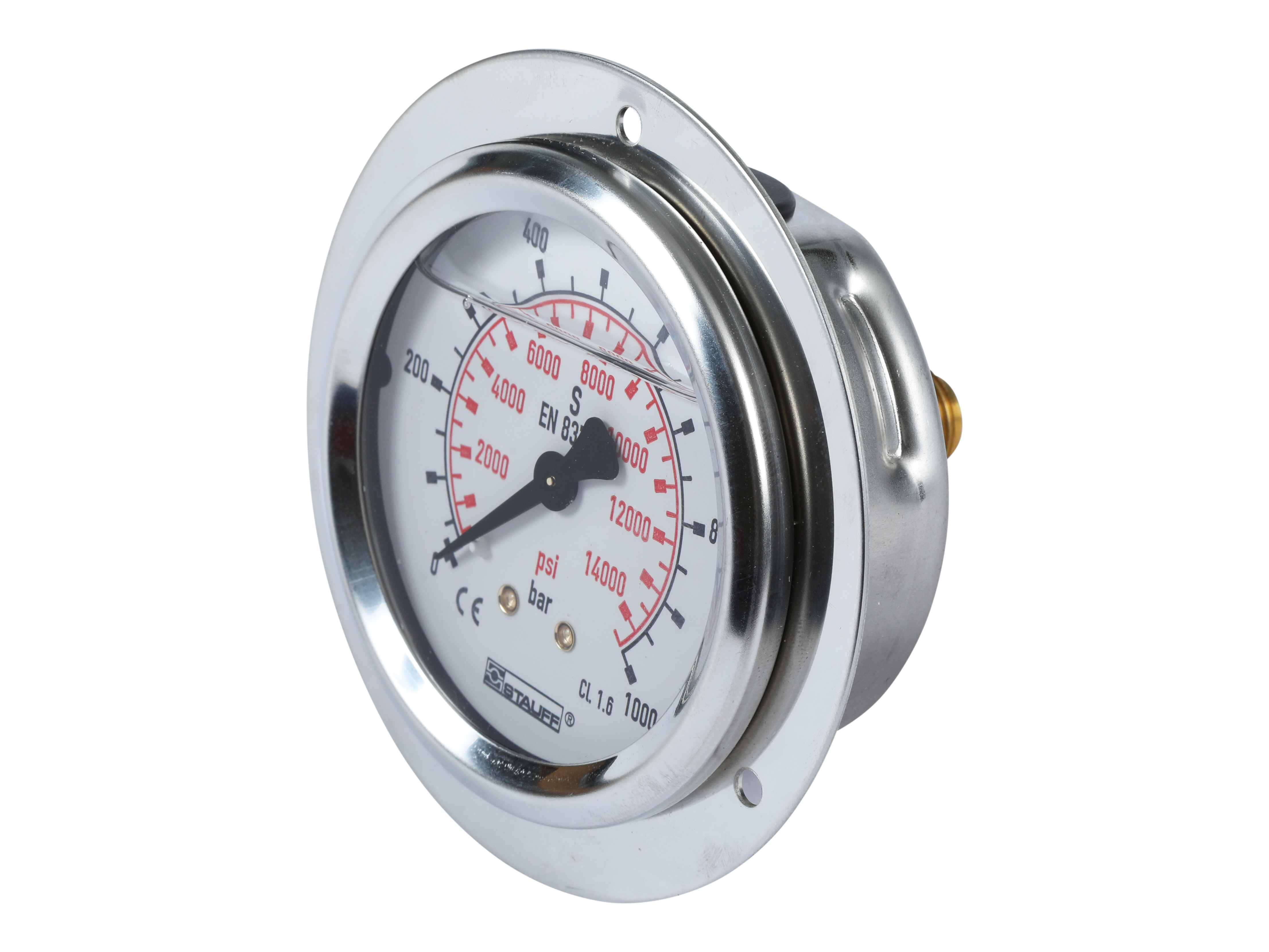 1/4" pressure gauge. Rear mount w. frontring. Scale 0-1000 b