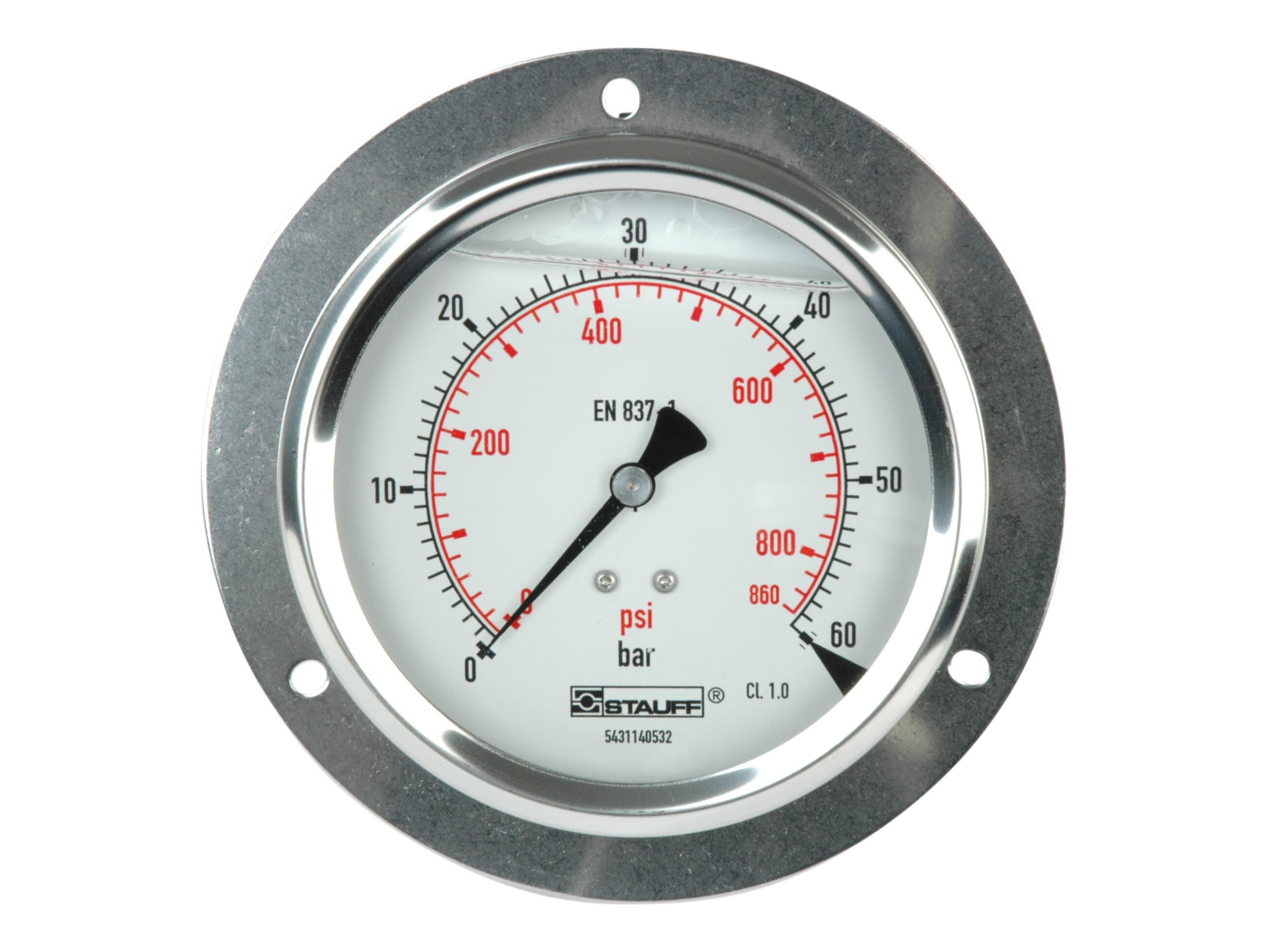 1/2" pressure gauge. Rear mount w. frontring. Scale 0-60 bar
