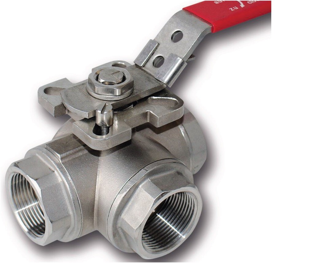 3-tiepalloventtiili, T-poraus, öljylle, vedelle ja muille aggressiivisille nesteille. ISO5211 yhteensopiva.