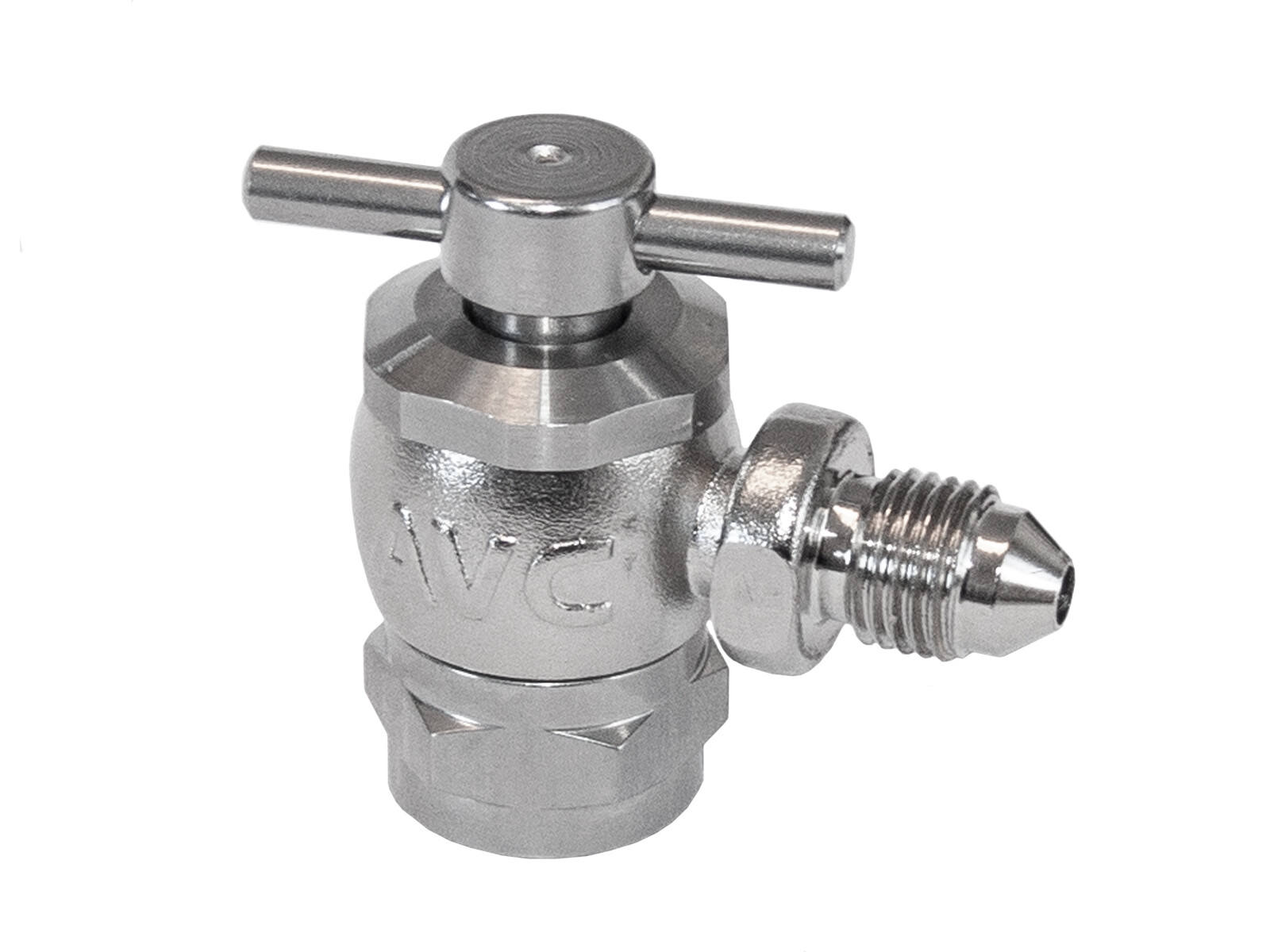 Robust elbow coupling designed for high-pressure applications up to 5,000 PSI. Fits .305-32 valve threads with 3/8"-24 connection to 3/16" flare pipe fittings and meets MS-33656E3 specification. The air connection is positioned at a 90° angle to the valve axis for easy access in tight spaces.