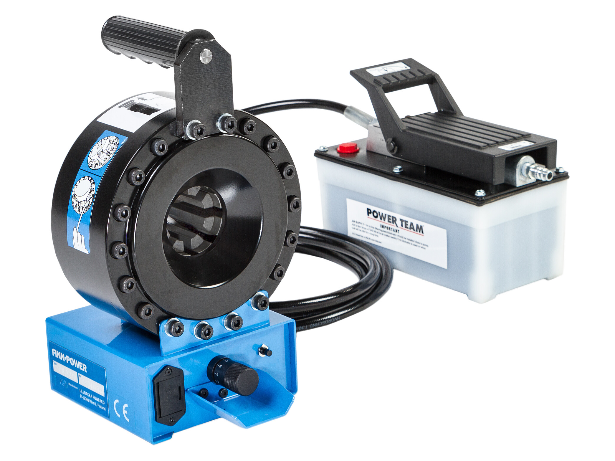 Finn-Power P16APZ is a compact portable hose crimper with air pump. Well-suited for smaller workshops and mobile use as the light weight allows it to be easily carried to any location.