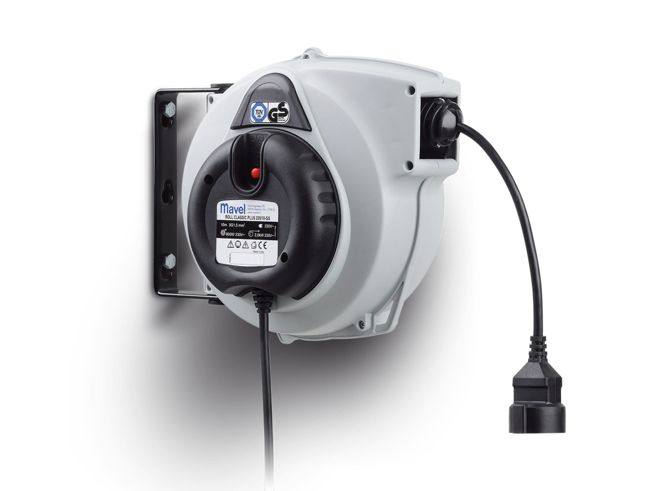 3x1,5mm2 10m 230V 800/2000W - Automatic spring winding - Plastic outer shell - Steel swivel wall bracket - Easy to check and remove end user - CE approved - TÜV approved