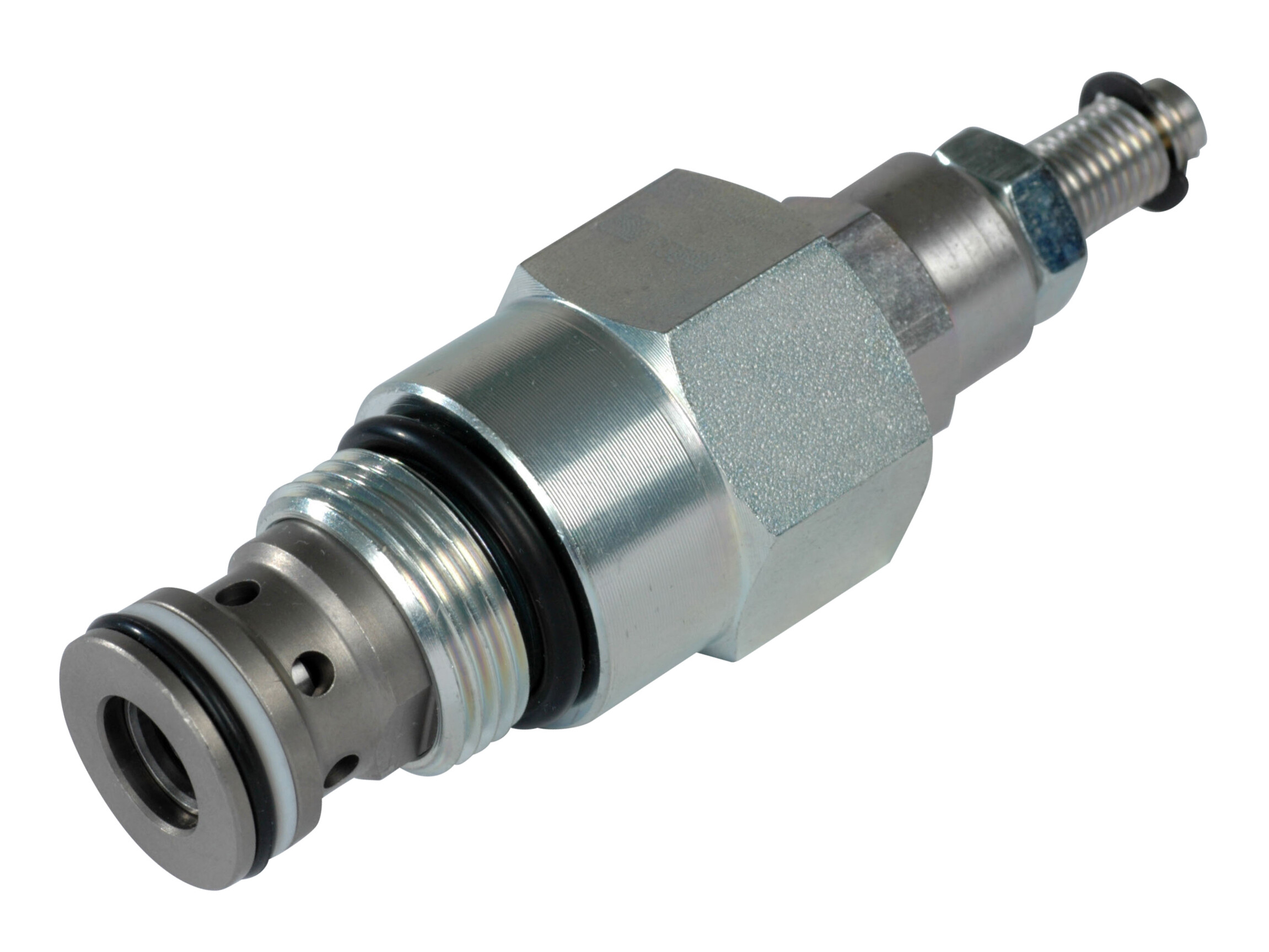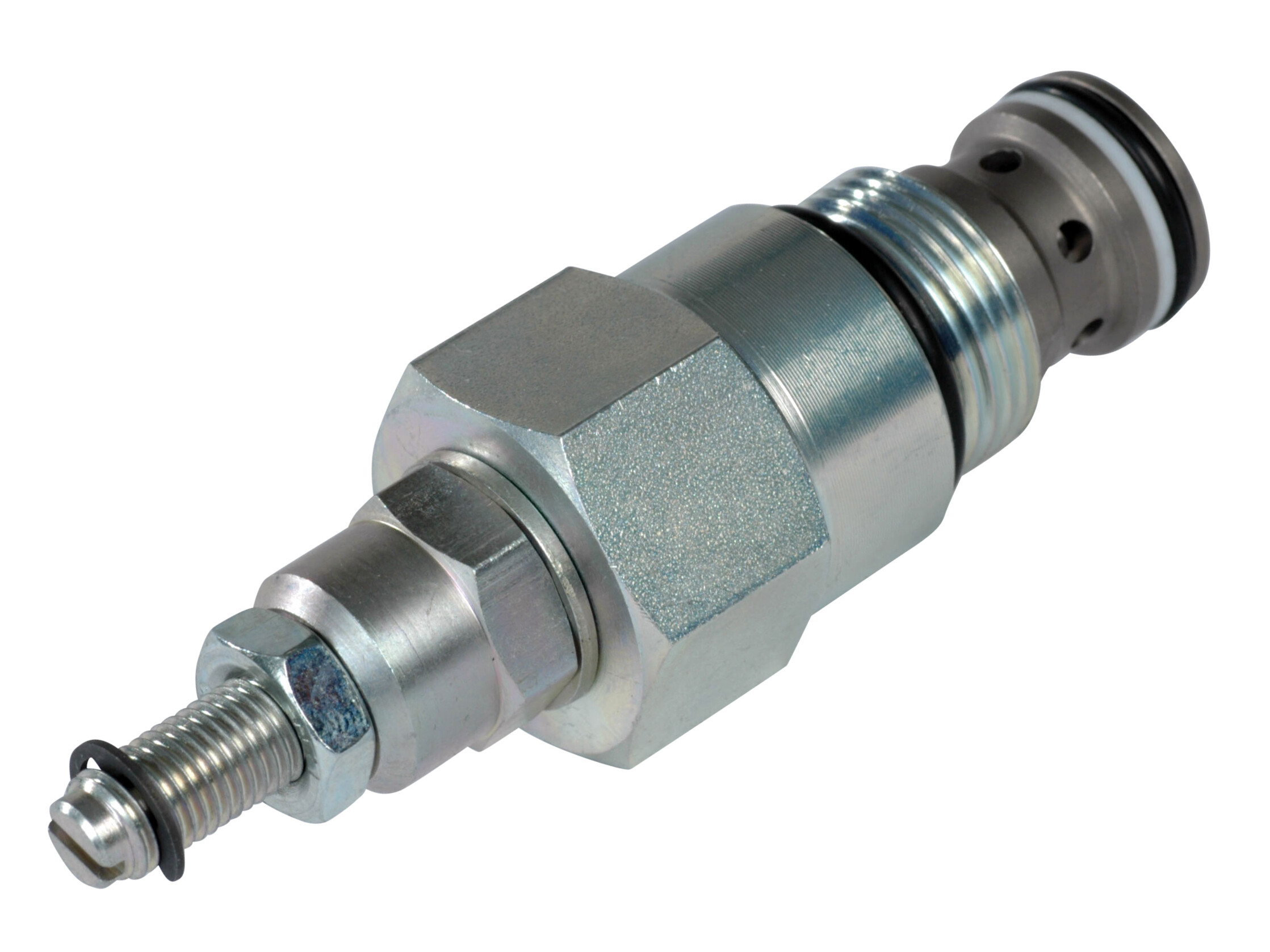 This valve is a limited adjustment, pressure compensated, restrictive-type flow control valve. To increase the flow, turn the adjustment screw clockwise. To decrease the flow, turn the adjustment screw counter-clockwise.