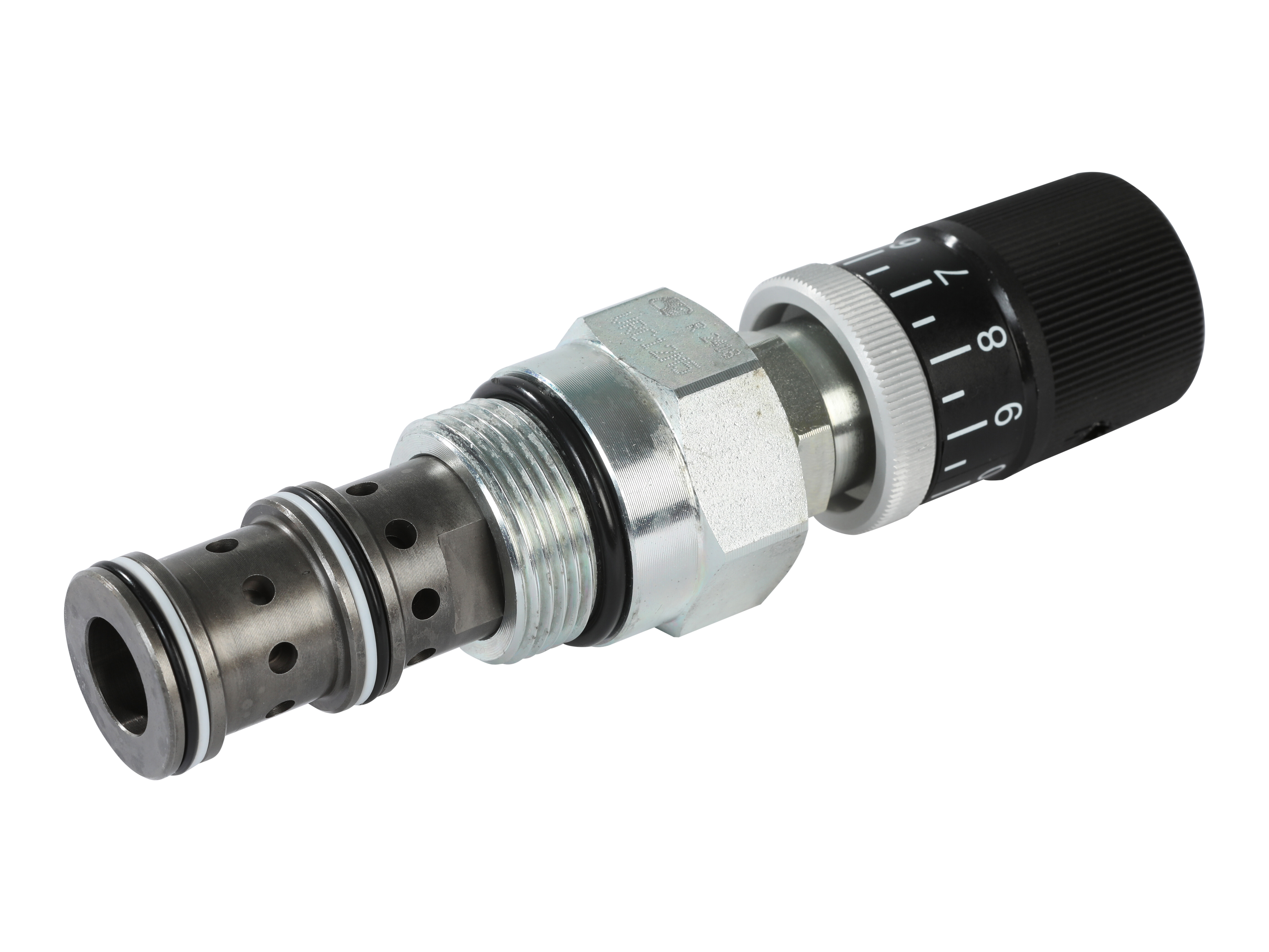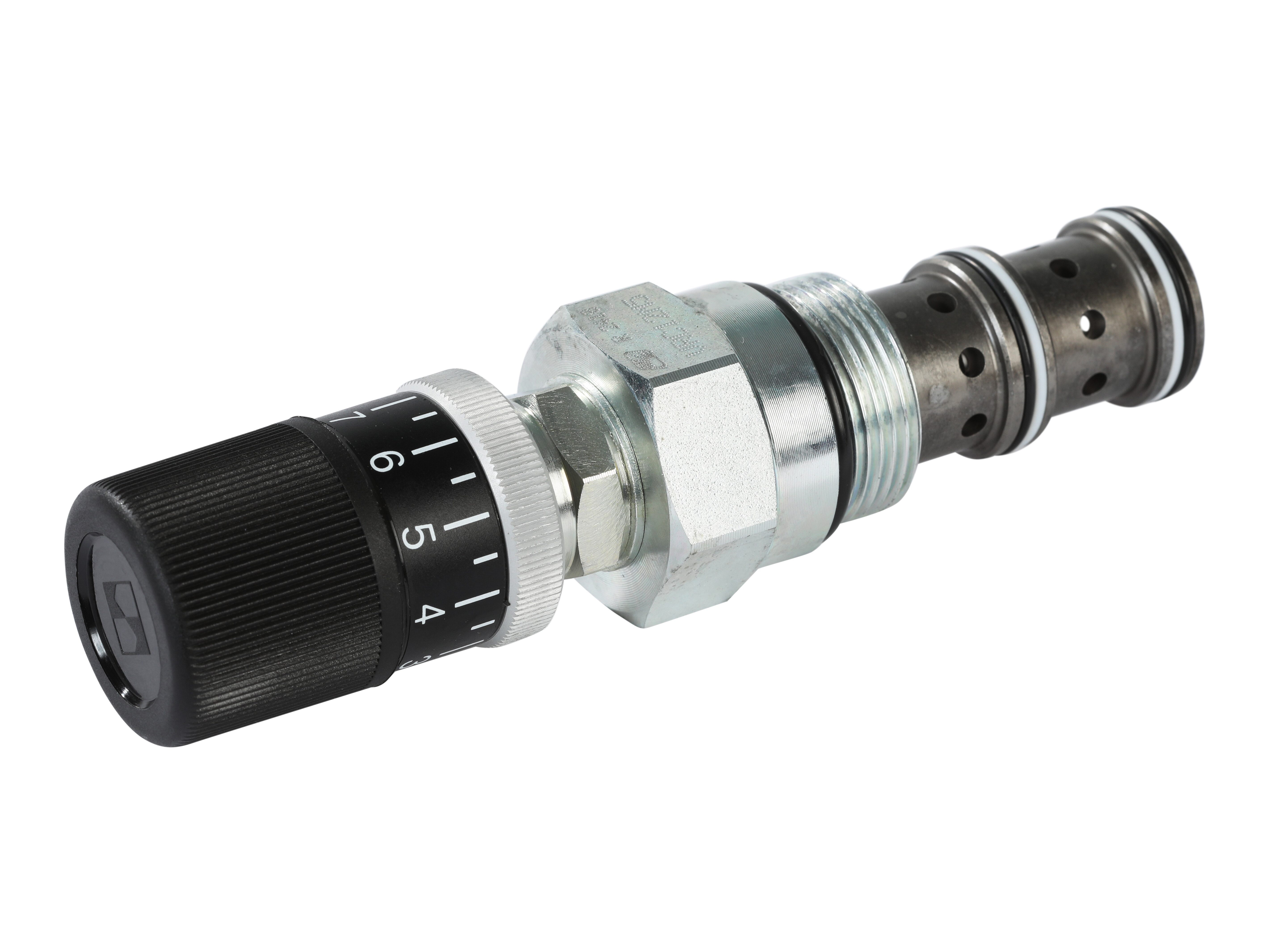 This is a partially adjustable, priority type, pressure compensated flow control valve, where the flow from port 3 will remain constant regardless of the pressure difference across the valve, while excess flow passes from port 1 to 2.