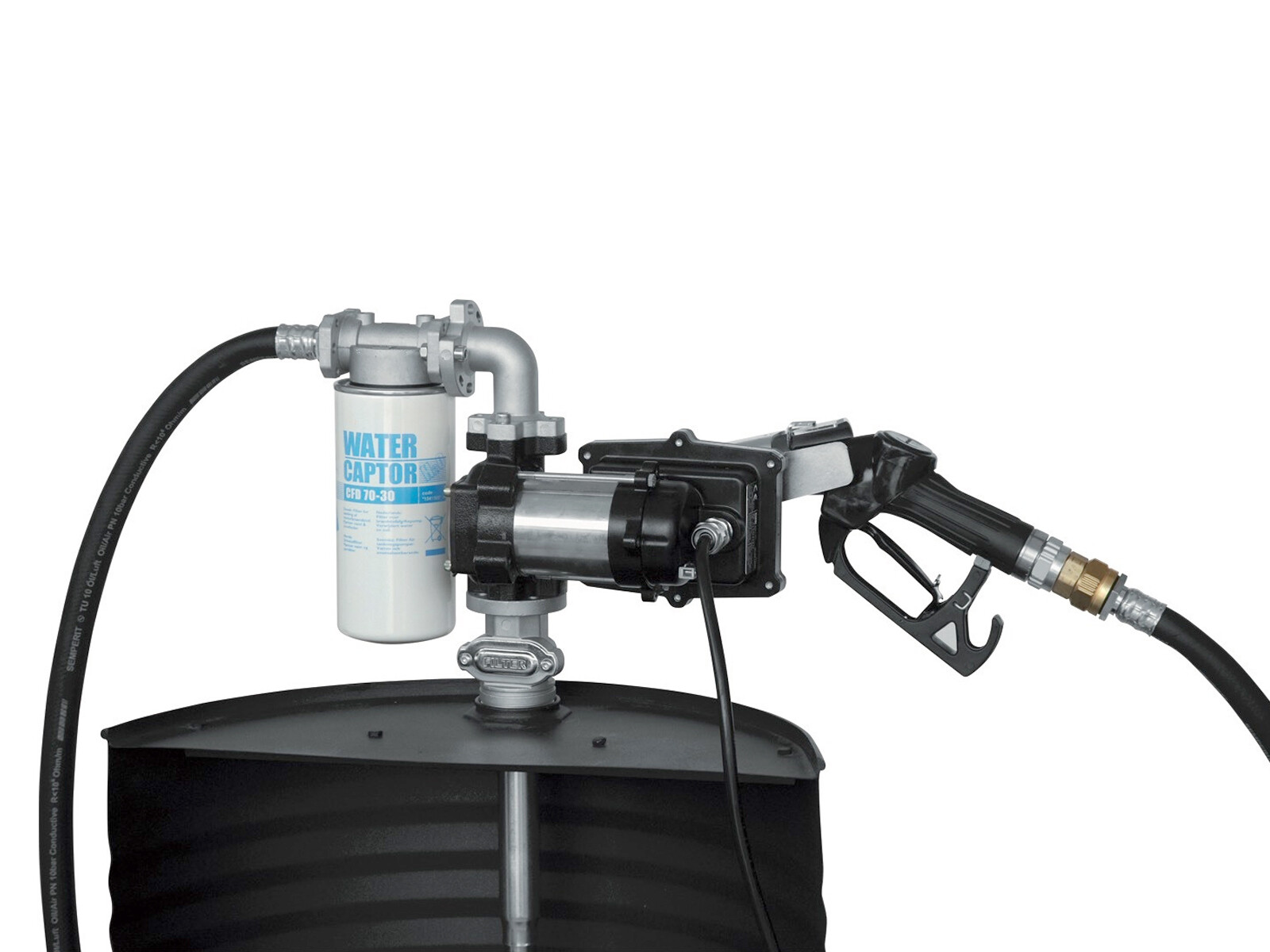 The transfer unit is a complete solution that includes: a telescopic suction hose for direct connection to the barrel and the attachment for the gun nozzle near the pump, located above the drum for a clean and efficient use of the fuel dispenser.