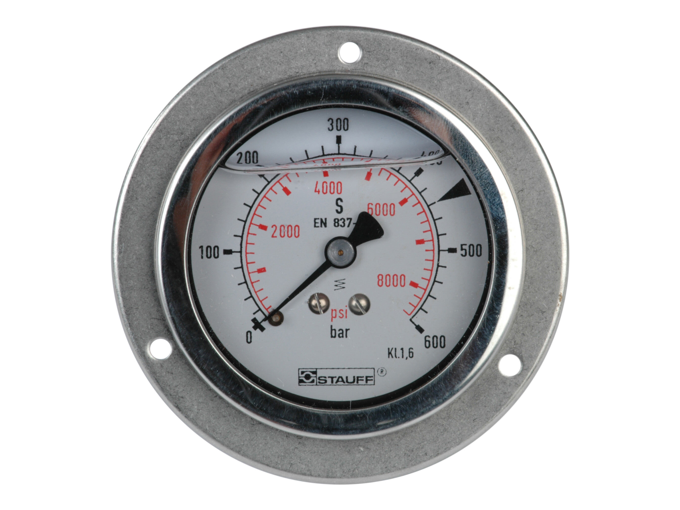 1/4" pressure gauge. Rear mount w. frontring. Scale 0-600 ba