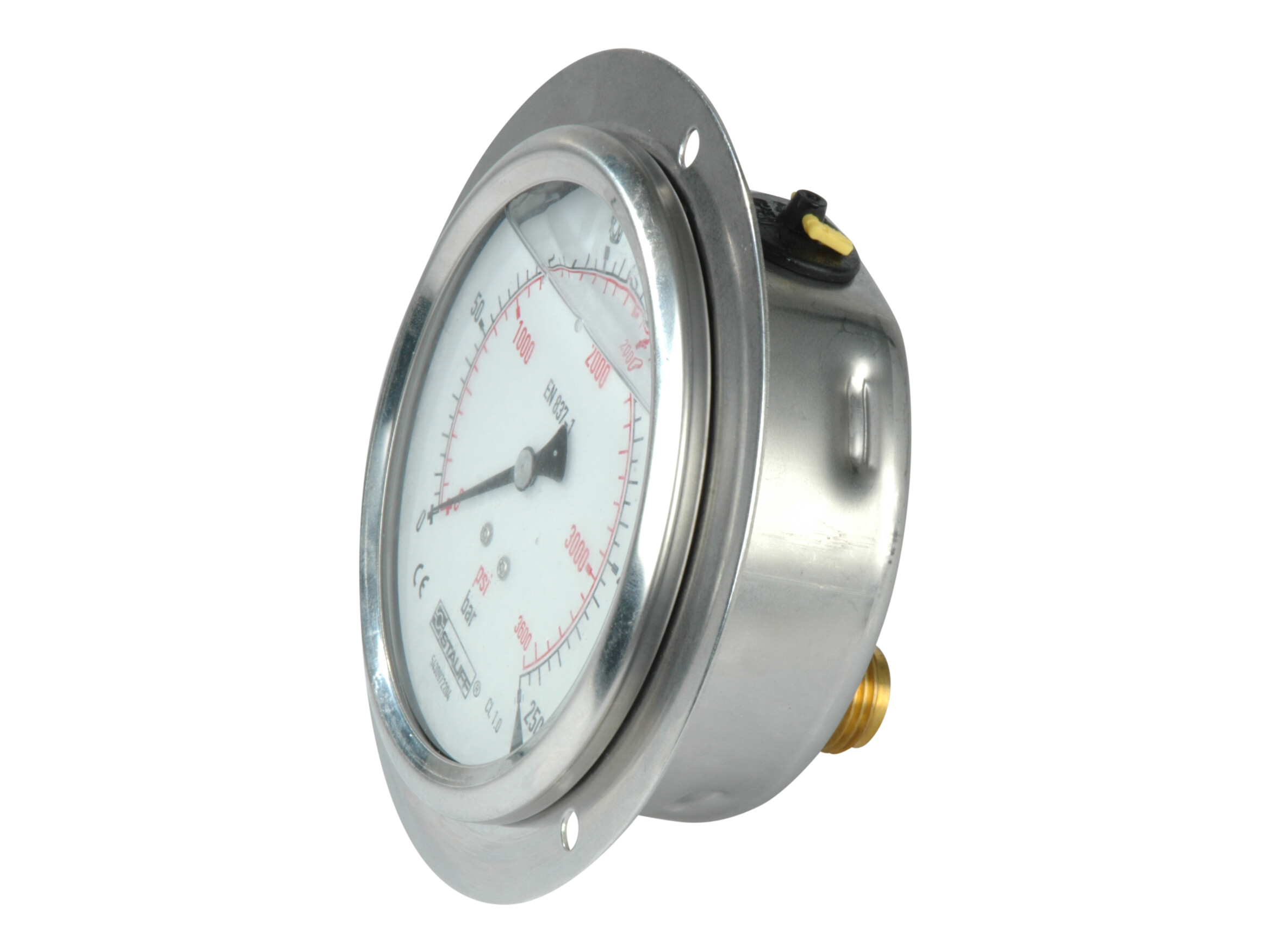 1/2" pressure gauge. Rear mount w. frontring. Scale 0-250 ba