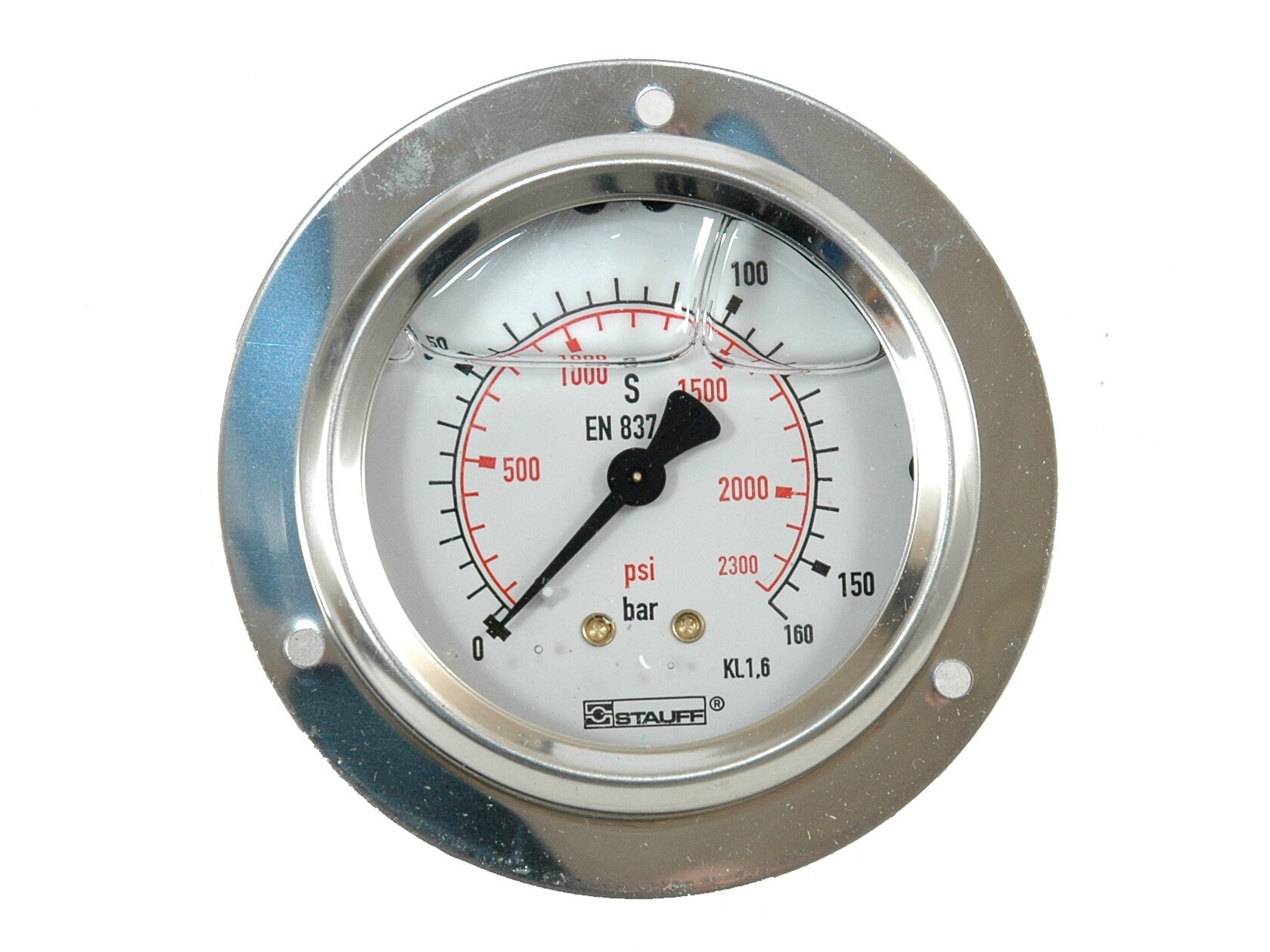 1/4" pressure gauge. Rear mount w. frontring. Scale 0-160 ba |