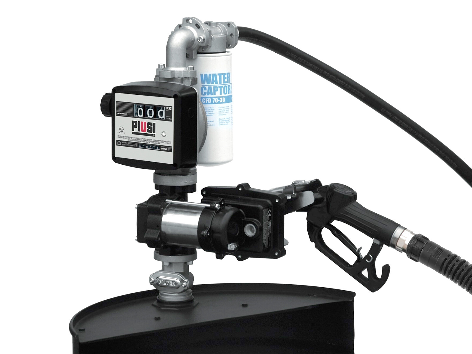 Överföringsenheten är en komplett lösning som inkluderar: en teleskopisk sugslang för direkt anslutning till fat och fäste för pistolmunstycket nära pumpen, som ligger ovanför trumman för en ren och effektiv användning av bränsledispensern.